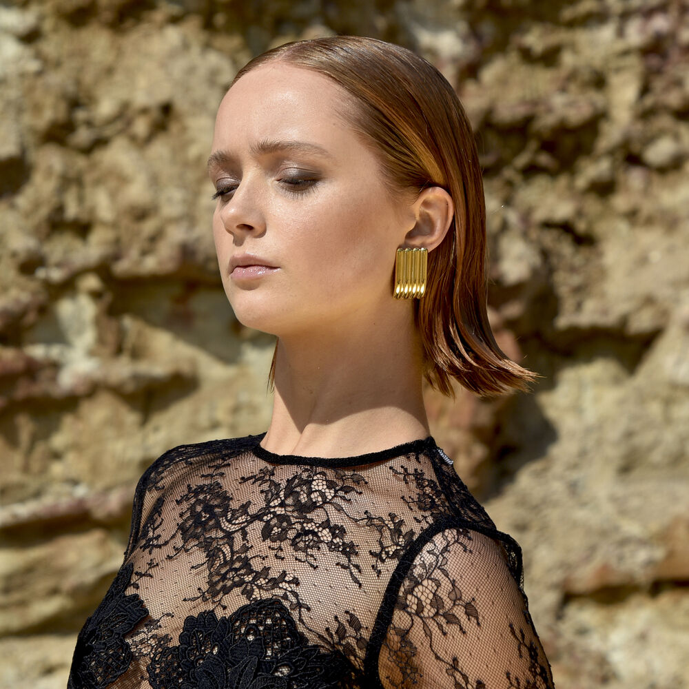 Ready to make an impression. Introducing Blaine Geo Statement Earrings (Gold) - a ready-to-rock ear love that instantly adds a fashionista vibe to your styling. This design features four vertical ribs side by side in a rectangular shape. The earrings are made of environmental friendly stainless steel with 18ct gold plating. Dress up or dress down, the statement impact remains. As seen in Melbourne Fashion Week - available in gold or silver.
