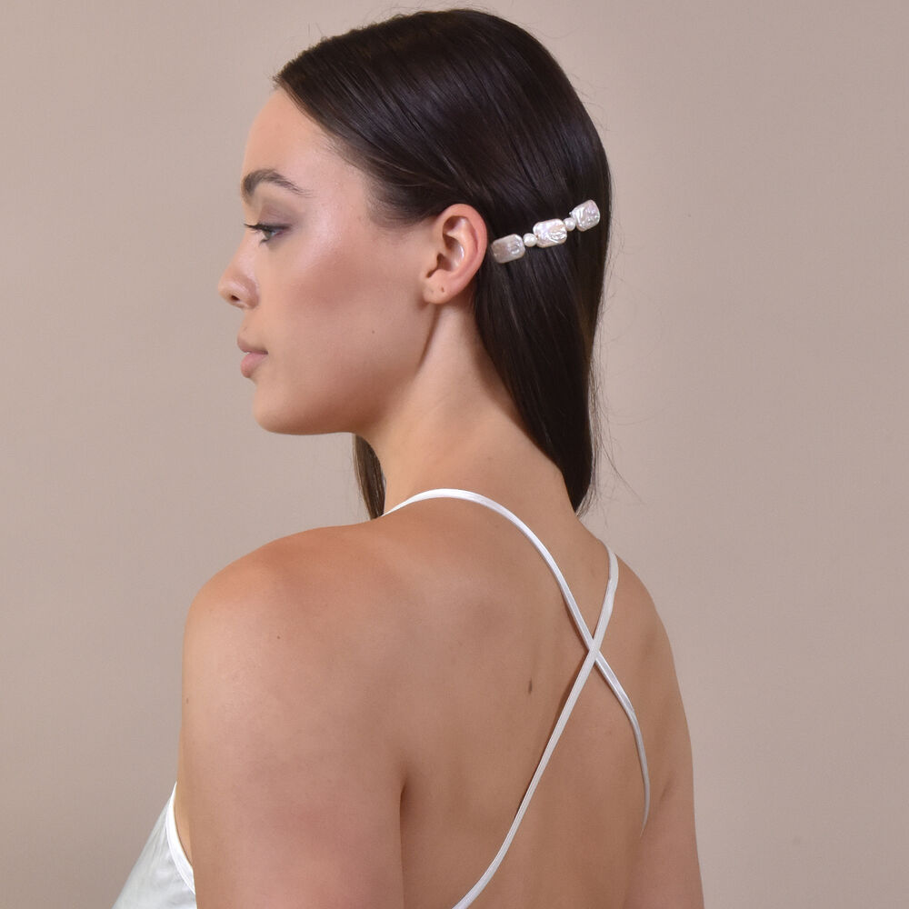 Pearl elegance in a unique combination. Introducing Arnette Artisan Baroque Pearl Barrette a hand-wired natural pearl beauty for both modern and retro style pearl lovers. This design features rectangular-shaped natural baroque pearls and round-shaped natural freshwater pearls. Each pearl has its own unique and authentic natural textures and is of high lustre. Perfect for coastal, summer, beach, bridal, wedding, dressy, earthy, bohemian, smart casual styles and more.