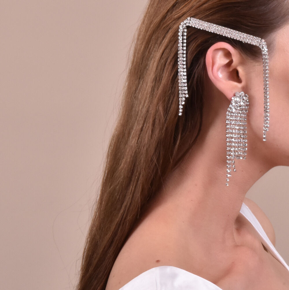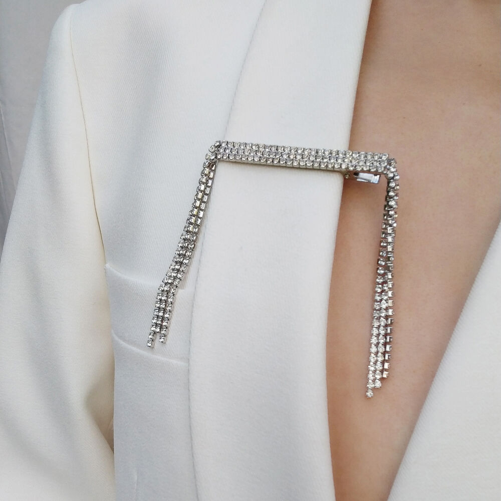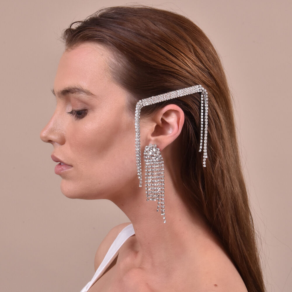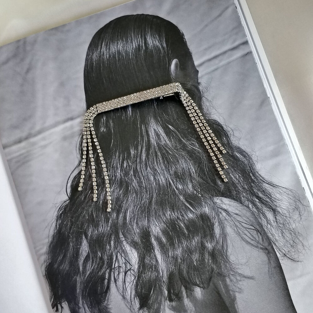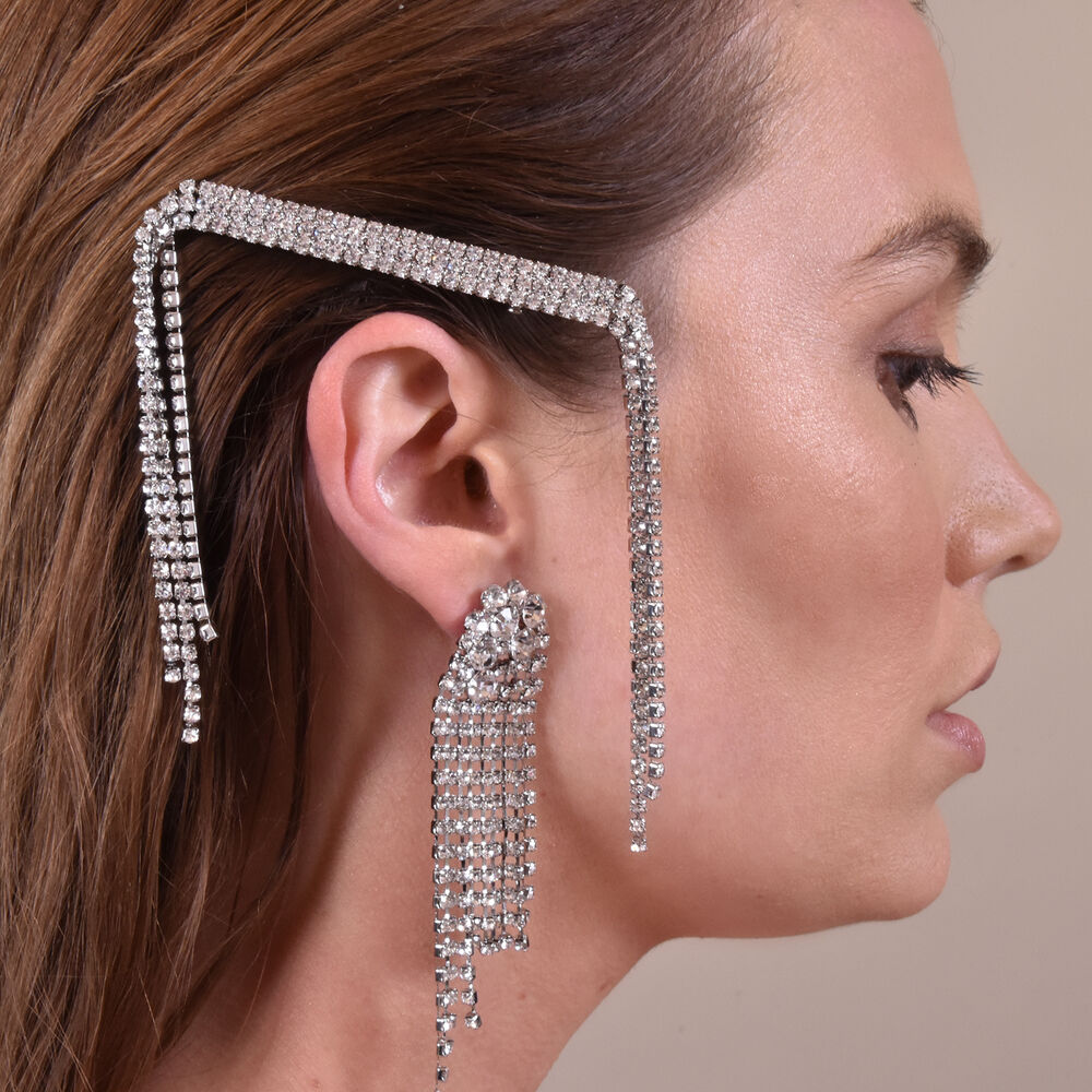 Something that is unique and can be worn in different ways. Introducing Botina Outside The Norm Barrette / Brooch - a runway style rhinestone barrette for lovers of uniqueness. This design features a rectangular shaped silver clip embellished with rhinestone tassels at the ends making it a bold and eye- catching statement. This piece can be used as a hair barrette as well as a brooch. Perfect for artsy, quirky, creative styling, high fashion, dressy, smart causal, casual styles and more.