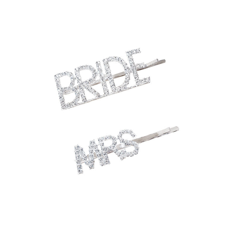 Rhinestone statement hair clip set Bride & Mrs Bride Hair Clip Length: 6.5cm; Width: 2.3cm; Weight: 8.2g Mrs Hair Clip Length: 6.3cm; Width: 1.5cm; Weight: 9.2g This item weighs 8.2g.
