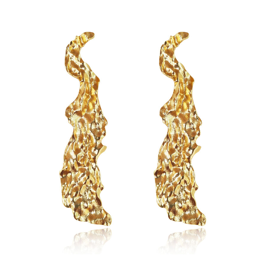 Textured art earrings inspired by coastal culture. Introducing Azure 22K Sculpture Art Earrings - an artisan crafted contemporary earring style for lovers of texture and uniqueness. This design features oyster shell textured gold with a shiny finish. The earrings are made of environmentally friendly brass (nickel free) with 2.5 microns of 22k gold plating, giving the pieces a luxurious gold shine that endures with time. An artsy and tasteful statement for modern, creative, dressy, high fashion, smart casual, casual styles and more. Hypoallergenic, nickel, cadmium and lead free.