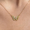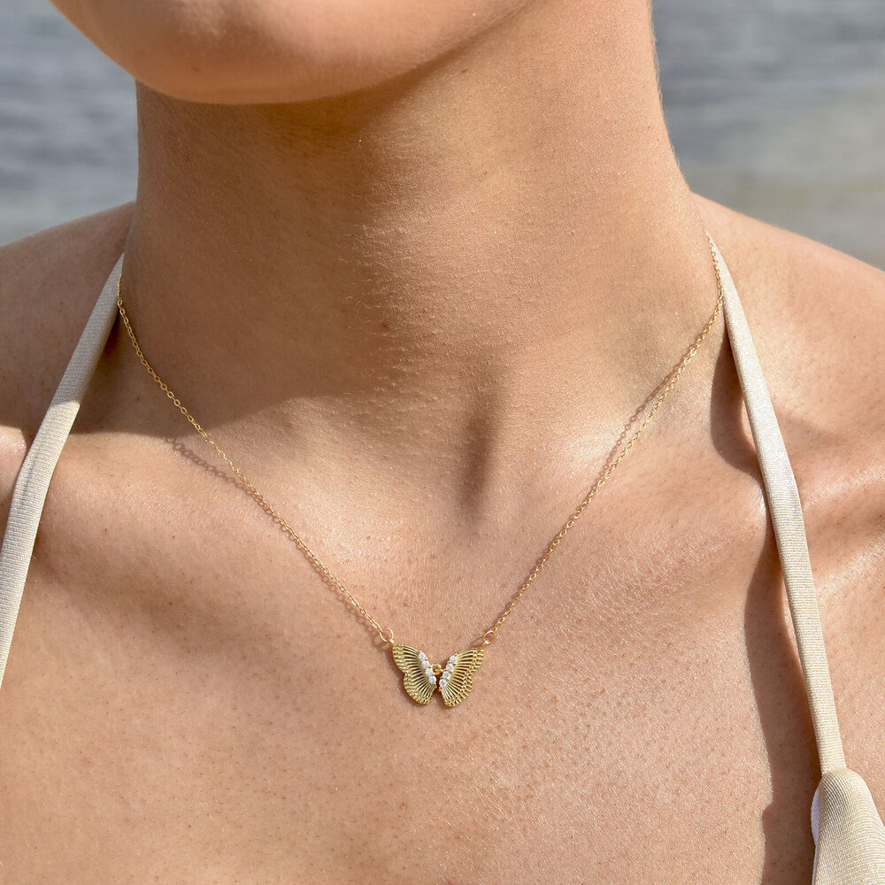 Embrace and excel in each new phase of life. Introducing Bindi Interlinked Butterfly Pendant Necklace (Gold) - a unique, creative and chic butterfly neckpiece to enhance the beauty of each stage of life. This design features an interlinked butterfly pendant adorned with clear Austrian diamantes in the middle. This neckpiece is created in sterling silver with 18ct gold plating for hypoallergenic and endure wear. Available in 18ct gold or silver. Suitable for chic, dainty, feminine, timeless, smart casual, casual, necklace layering, everyday style and more. Hypoallergenic, nickel, lead, and cadmium free.