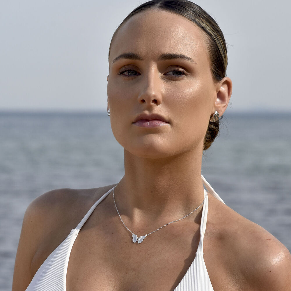 Embrace and excel in each new phase of life. Introducing Bindi Interlinked Butterfly Pendant Necklace (Silver) - a unique, creative and chic butterfly neckpiece to enhance the beauty of each stage of life. This design features an interlinked butterfly pendant adorned with clear Austrian diamantes in the middle. This neckpiece is created in sterling silver with precious white rhodium plating for hypoallergenic and endure wear. Available in 18ct gold or silver. Suitable for chic, dainty, feminine, timeless, smart casual, casual, necklace layering, everyday style and more. Hypoallergenic, nickel, lead, and cadmium free.