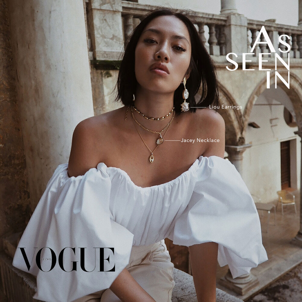 Chic-elegance with a lighthearted fun, introducing Jacey Coastal Muse Necklace - a modern coastal style neckpiece to delight your everyday styling. This contemporary design features classic gold necklace with handcrafted shell drop pendant decorated with white and pink freshwater pearls. The necklace is crafted in environmentally friendly brass (nickel free) with 14K gold plating; and the natural shell also comes with 14K gold plated rim. Perfect for girly, chic, modern, beach, coastal, boho, dress, casual styles and more.