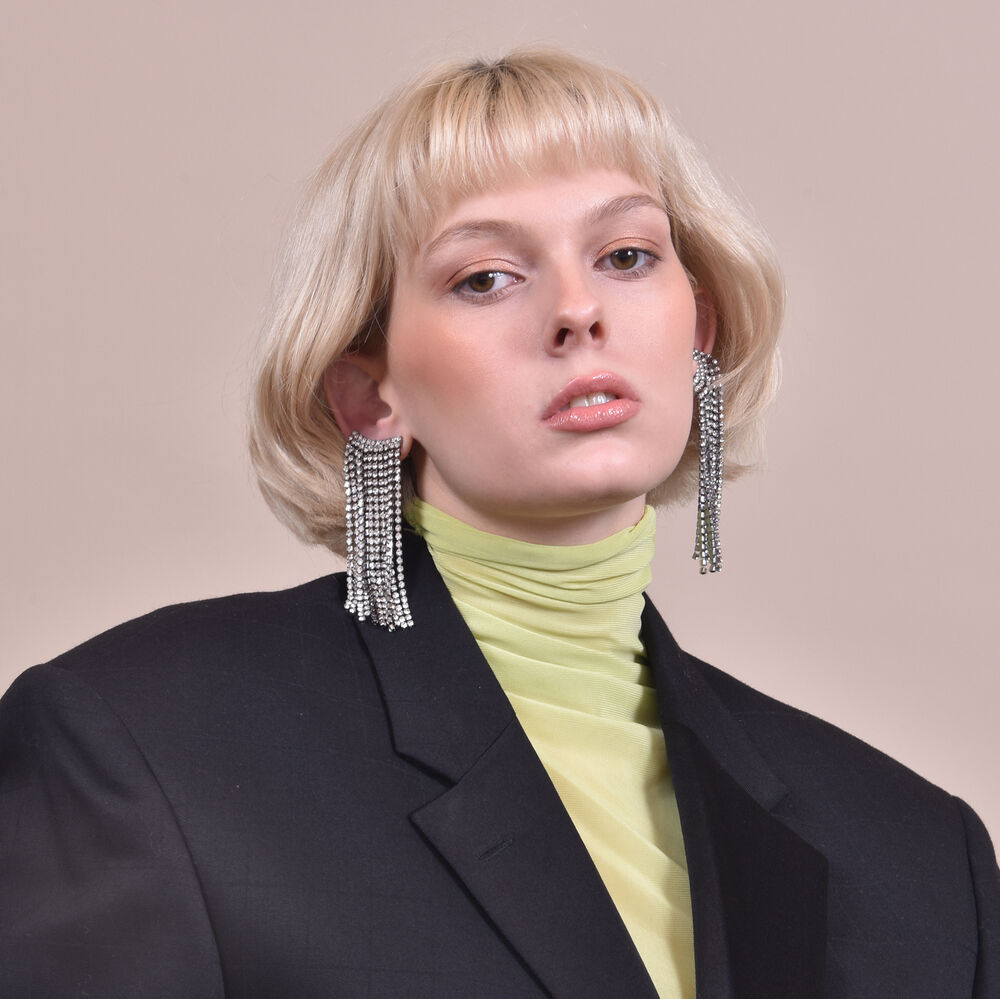 A stylish statement that turns heads. Introducing Lais Diamante Tassel Earrings - an extravagant runway style ear love for a flared stir. This design is crafted in environmentally friendly copper alloy (nickel free) with 11 rolls of clear diamantes forming a glamorous shimmering feather down your ears. Perfect for modern, extravagant,evening, dressy, fashion events and creative styling.
