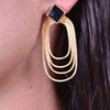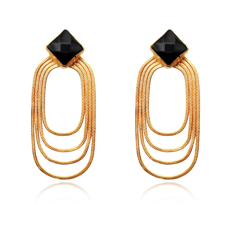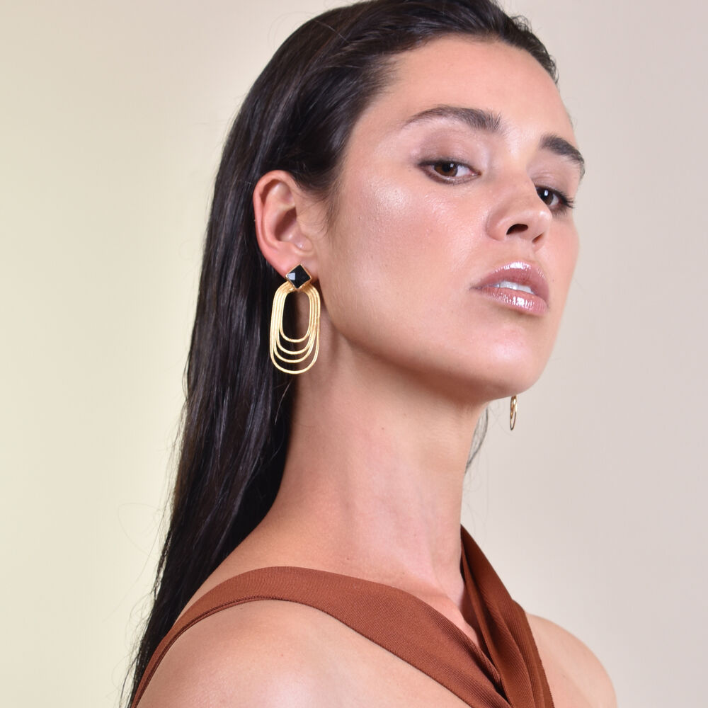 Loops within loops, covered in gold. Introducing Leora Artisan 24K Gold Layered Earrings - an artisan crafted piece with a highlight of natural black onyx gemstones. This design features 4 oval loops with varied length joined together at the top behind a natural black onyx gemstone nested in a diamond shaped pocket. The earrings are made of environmentally friendly brass (nickel free) with 24k pure gold plating. Perfect for modern, artsy, creative styling, high fashion, dressy, chic, punk, smart casual styles and more. Hypoallergenic, nickel, cadmium and lead free.