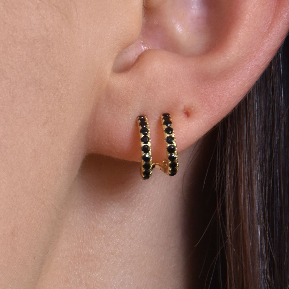 Everyday elevated chic style done effortlessly. Introducing Sydney Dainty Twin Loop Earrings a defined and delicate ethical ear love for modern muses. This design is crafted in solid sterling silver with 2.5 microns of 18K gold plating (to Gold Vermeil Jewellery Standards). It features 2 half loops joined at one end, embellished with pave quality black zircon. Simple and sophisticated, this pair makes a perfect dainty statement for fine style lovers. Hypoallergenic, nickel, cadmium and lead free.