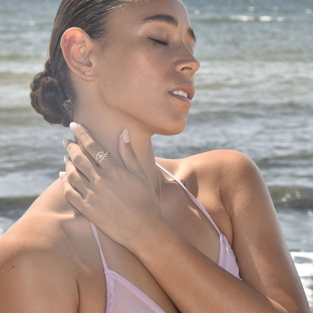 Adding an artsy era to your evil eye collections. Introducing Una Artisan Evil Eye Open Ring (Gold) - a unique finger love with sparkles to delight your mood. This design features an open ring band with an evil eye at the bottom and an eyelash highlight above the evil eye, both embellished with Austrian cubic zirconias. The ring is made in solid sterling silver with 18K gold plating for hypoallergenic and enduring wear. Perfect for evil eye lovers of all ages. Hypoallergenic, nickel, lead, and cadmium free.