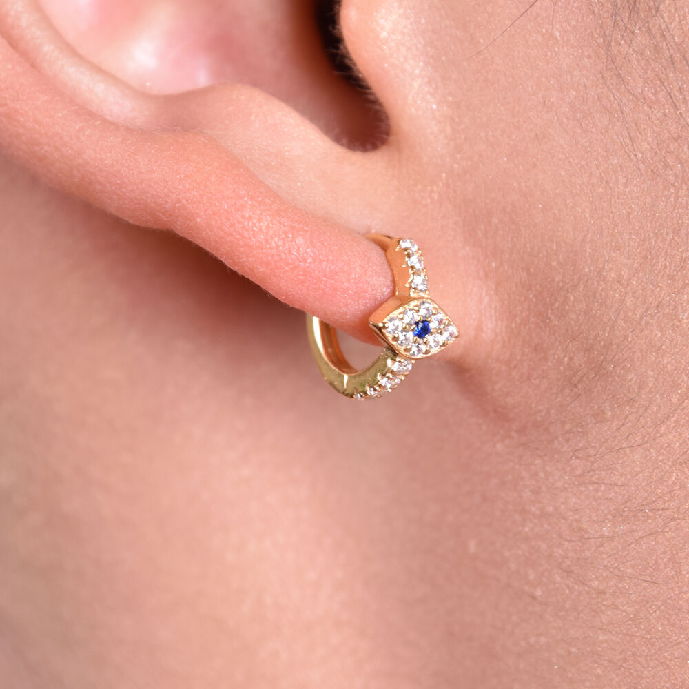 Delicate, unique and stylish. Introducing Aliyah Dainty Evil Eye Hoop Earrings - a contemporary evil eye style ear love for lovers of uniqueness. This design features cubic zirconia embellished evil eyes embedded at the front of the earring hoops. The earrings are made of solid sterling silver with 18k gold plating for hypoallergenic wear. Perfect for modern, artsy, chic, minimalist, earring layering, punk, casual, everyday styles and more. Suitable for all age groups. Hypoallergenic, nickel, cadmium and lead free.