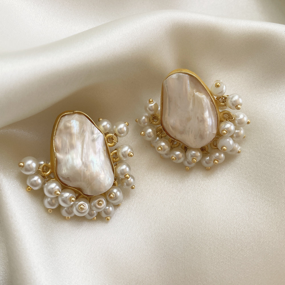 Light luxury with handcrafted unique pearl beauties. Introducing Antoinette 22K Pearl Bouquet Earrings - an artisan natural pearl ear love handmade with love. This design features natural blister baroque pearls embedded in handmade gold pockets. Due to the natural shape of each pearl, each gold pocket is handcrafted to best compliment the outline of each pearl. The earrings are made of environmentally friendly brass with 22k gold plating. Surrounding the pearls are simulated pearl-shimmered beads, adding a flourish glamour to the pieces. A unique pearl earring statement for formal, semi-formal, wedding, bridal, bridesmaids, dressy, feminine, chic, girly, smart casual styles and more. Hypoallergenic, nickel, cadmium and lead free.