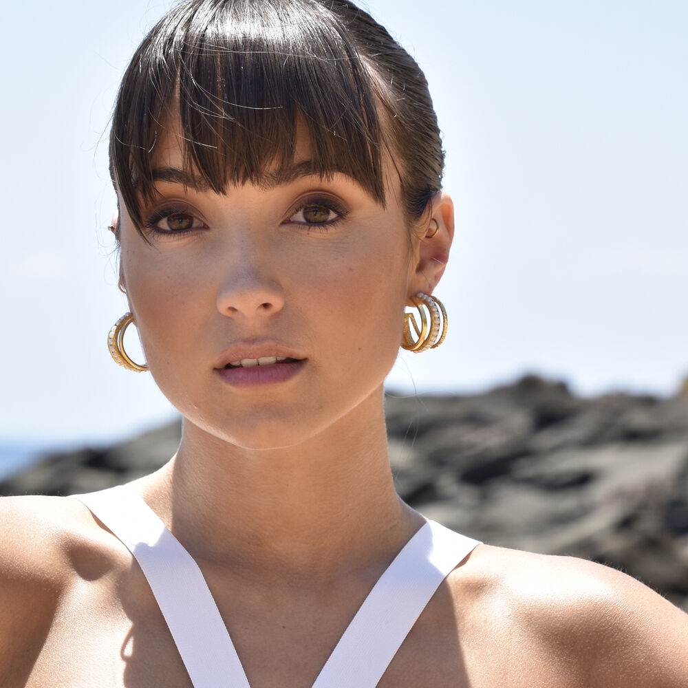 Embracing curves and lines with a sparkle of pearls. Introducing Bijoux 24K Gold Trio Hoop Earrings - an artisan crafted hoop statement with a light luxury and distinctive style. This design features 3 curved lines joined at each end - 1 line is smoothly polished, 1 line with a textured finish and the middle line is a channel filled with cultured rice-shaped freshwater pearls. The earrings are made of environmentally friendly brass (nickel free) with 2.5 microns of 24k pure gold plating, heavily gold plated to premium jewellery standards. A playful and stylish hoop statement made of congruent quality with attention to details. Perfect for modern, retro, boho, coastal, bridal, wedding, dressy, high fashion, smart casual, casual styles and more. Hypoallergenic, nickel, cadmium and lead free.