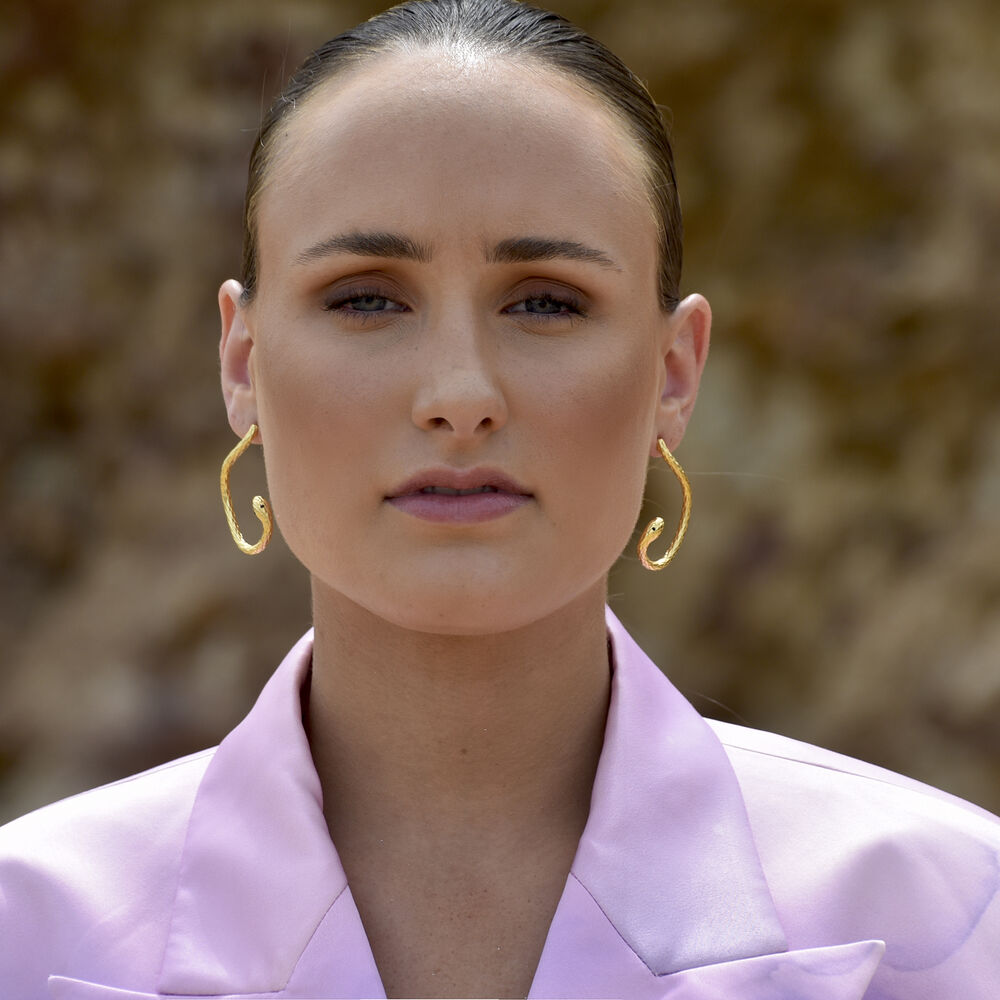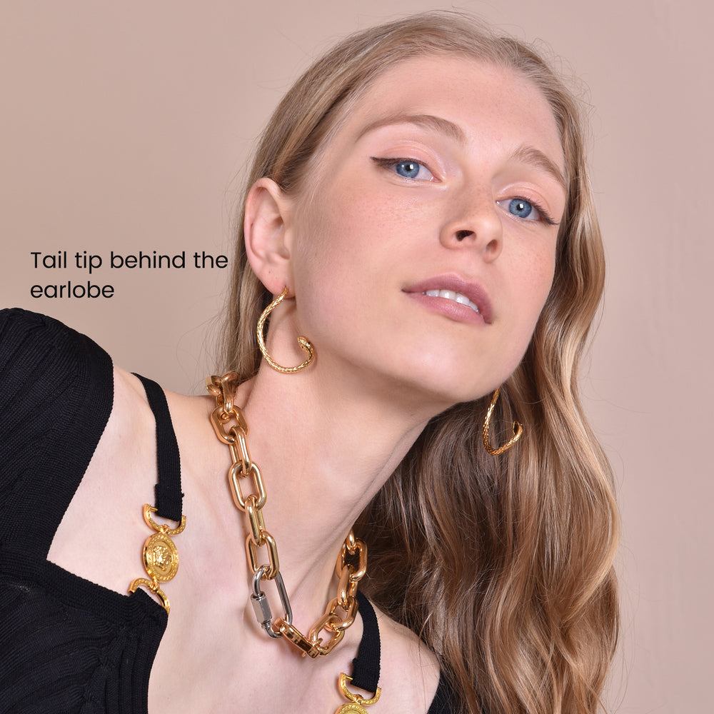 Sophisticated, unique and outspoken. Introducing Charmante Artsy Winding Serpent Earrings - a contemporary creative ear statement for those who seek something extraordinary and dare to wear beyond the norm. This design features large winding snake drops with the tail tips as the earring backings. There are two ways to wear this earring: tail tip in front of the earlobe or tail tip behind the earlobe (please see image gallery). The earrings are made of environmentally friendly brass (nickel free) with high quality 18k gold plating (3 layers) to premium jewellery standard, giving the pieces a luxurious gold shine that endures. Perfect for artsy, creative, high fashion, runway, creative styling, fashion events, smart casual styles and more. Hypoallergenic, nickel, cadmium and lead free.