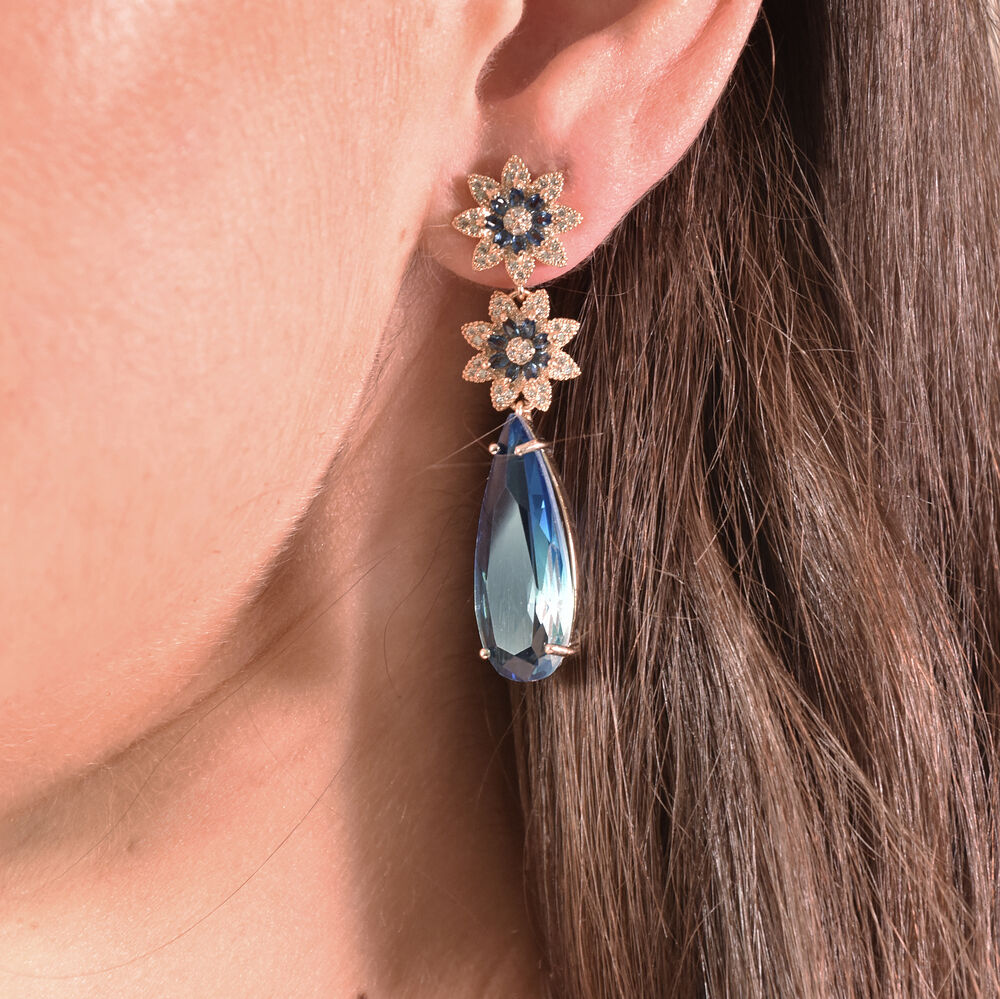 Elegance enriched with luxury details. Introducing Claramay Glamour Zircon Drop Earrings - a dressy earring style for glamorous occasions. This design features large ocean blue Austrian zircons in a prone setting style. Blue zircon is pleochroic, meaning it can appear to be different colours when viewed from various angles.The petal top is finely crafted and embellished with Austrian blue zircons and clear zirconias. The earrings are made of environmentally friendly brass with 14k gold plating, giving the earrings a subtle light gold shine that is gentle and endures. Perfect for formal, semi-formal, dressy, evening, wedding, bridal, award, high fashion, racing, feminine styles and more. Hypoallergenic, nickel, cadmium and lead free.
