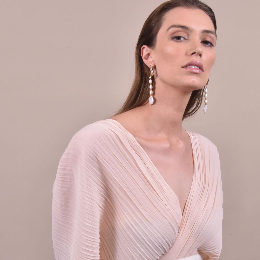 Pearl elegance infused with artsy creativity. Introducing Desiree Artisan 24K Pearl Drop Earrings a handcrafted earring art to spark uniqueness and high fashion sense. This design features a hand-drop metal top attached to a string fall of pearls. The pearls used in this design are cultured freshwater pearls (3 pearls in the middle) and natural flat and round-shaped baroque pearls (the bottom pearls). The metal used in this design is environmentally friendly brass (nickel free) with pure 24k gold plating, giving the piece a luxurious gold shine that endures. Perfect for modern, formal, semi-formal, dressy, coastal, artsy, creative styling, runway, smart casual styles and more.