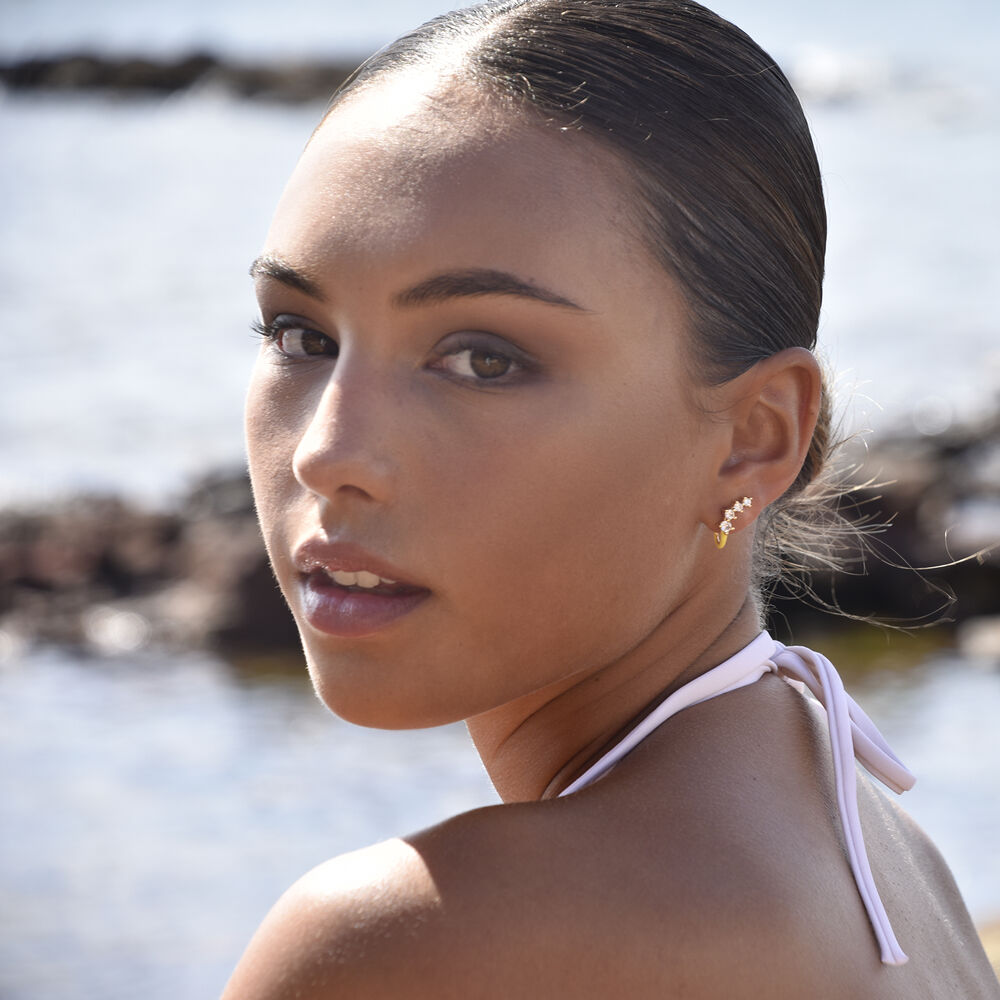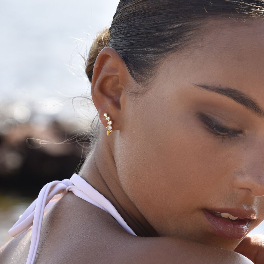 Dreamy pastels adorned with subtle wings of diamantes. Introducing Gabrielle Artsy Pastel Diamante Climber Earrings (Yellow) - an artsy and unique ear piece for style hunters after something subtle yet different. This design features stud earrings with a curved row of Austrian zirconia diamantes connected with a U-hook underneath in pastel yellow enamel coating. The climbing diamantes form a gentle shimmering curve on your ear while the U-hook hugs the earlobe. The earrings are made in environmentally friendly brasswith 18K gold plating. Perfect for modern, creative, chic, minimalist, earring layering, smart casual, casual, everyday styles and more. Perfect for layering.