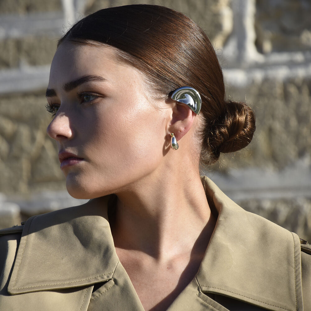 Where art meets anatomy - Introducing Hanako Sculpture Ear Cuff (Silver Pair), a contemporary creative ear art tracing the natural curves / frame of the ear. This design features one single ear cuff following the ears silhouette in a fluid, sculptural form, with a clip on the back of the cuff to affix the cuff to the ear. The tightness of the clip can be manually adjusted to ensure a secure positioning of the cuff. The earring is made in environmentally friendly stainless withsilver plating, in a smoothly running polishing finish. Perfect for trend-setting fashionistas to strike a head turning statement. Available in silver and in single piece.