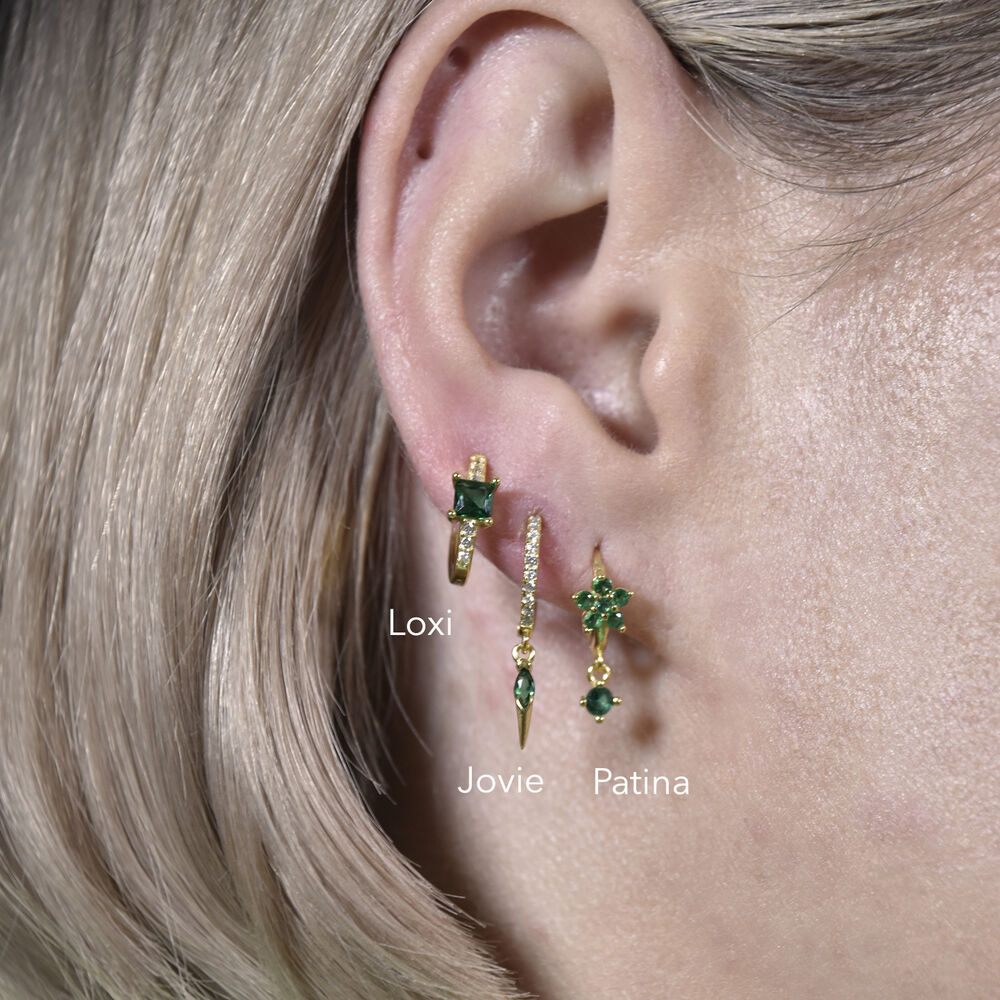 Green is the gaze of loveliness. Introducing Jovie Dainty Zircon Spike Drop Earrings (Emerald Green) - a simple and chic bright pop for your effortless everyday styling. This design features Austrian green zircons encased in spike-shaped drops, attached to dainty gold hoops. The front half the gold hoops are embellished with clear Austrian cubic zirconias. The earrings are made in solid sterling silver with 18K gold plating for hypoallergenic and enduring wear. Perfect for modern, chic, minimalist, punk, earring layering, smart casual, casual, everyday styles and more. Hypoallergenic, nickel, lead, and cadmium free.
