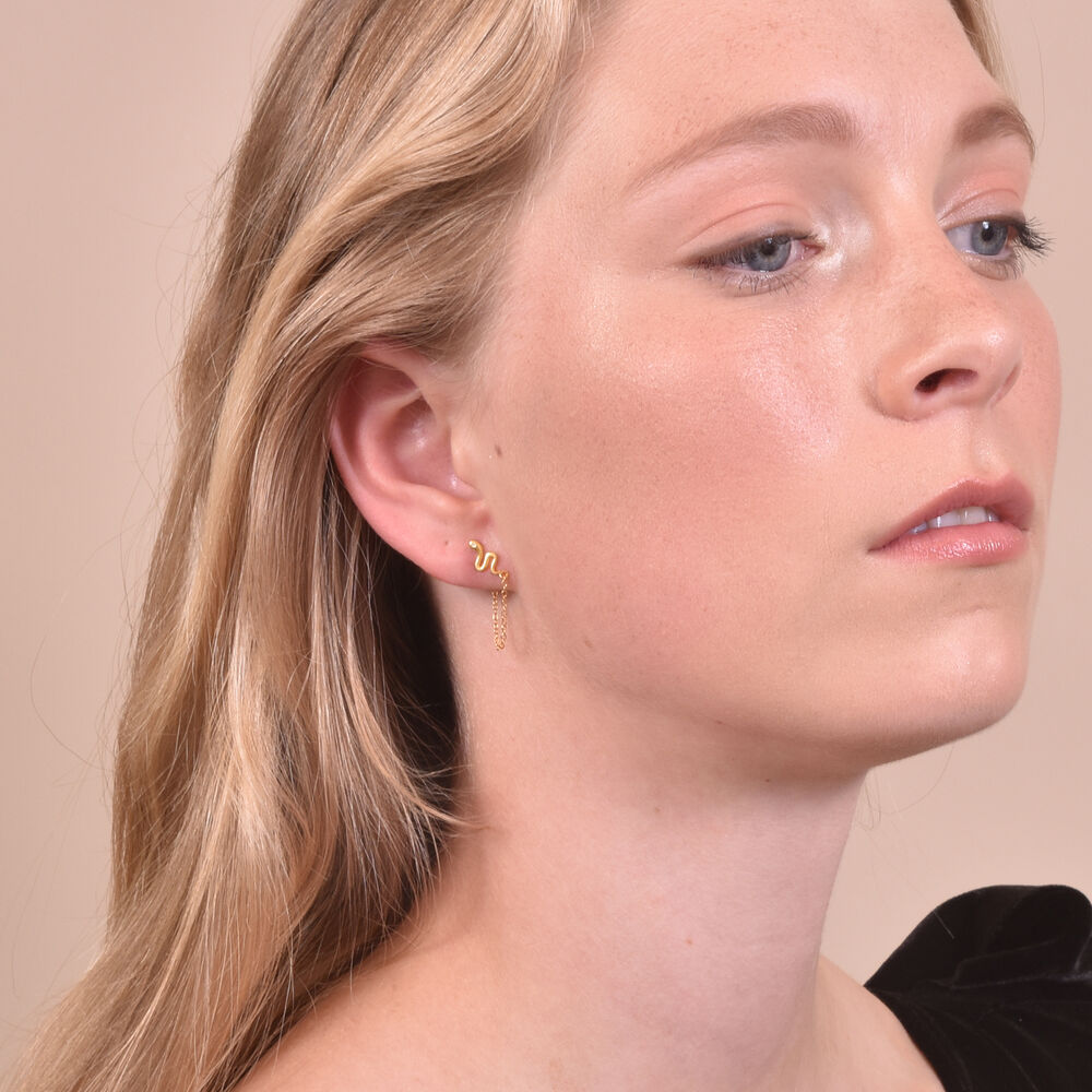 Delicate, detailed and 'attitude-rich', introducing Kalea Gold Filled Snake Chain Earrings - an on-trendy snake style that brings a fuller styling dimension to your ears. Sensitive ears? Not a problem. This design is crafted in sterling silver with 18K gold filled to ensure comfortable wear and long-lasting yellow gold shine. Super versatile and fun, this style is perfect for mismatching or multiple earring wearing with other dainty pieces. Wear outside the box! Sold as pairs.