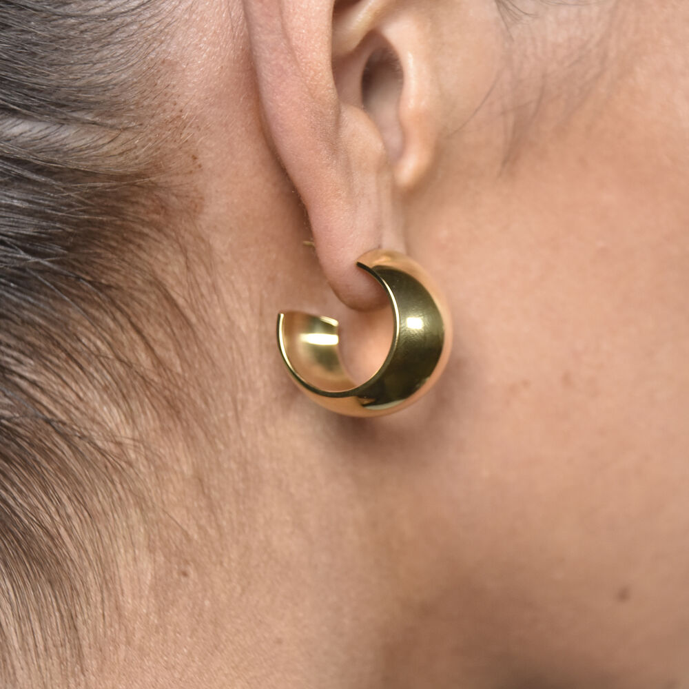 Sleek, chunky and uncompromising. Introducing Maxine Fashionista Chunky Bowl Earrings - an on-trend hoop statement and muse essential to rock your trendy chic styles. This design features wide chunky C hoops smoothly polished to a reflective high shine. The earrings are made in environmentally friendly stainless steel with 18K gold plating. A simple yet bold statement that speaks for itself. Perfect for modern, retro, chic, smart / elevated casual styles and more. Hypoallergenic, nickel, cadmium and lead free.