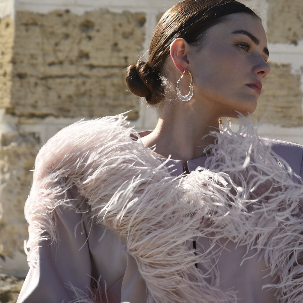 I see metal as fluid architecture. Introducing Vanora Two Tone Fluid Loop Earrings - a contemporary and artsy style ear love that embraces flow, sculptured form and asymmetric beauty. This design features an irregular shaped loop with 2/3 made of metal (environmentally friendly brass with 14K gold plating) and 1/3 made of clear resin. A creative statement that compliments modern, semi-formal, smart casual, artsy, casual styles and more. Hypoallergenic, nickel, cadmium and lead free.
