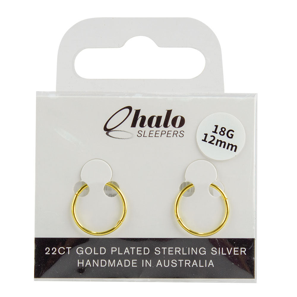 Halo Sleepers 12mm 22ct Gold Plated Sterling Silver Sleeper Earrings 18G