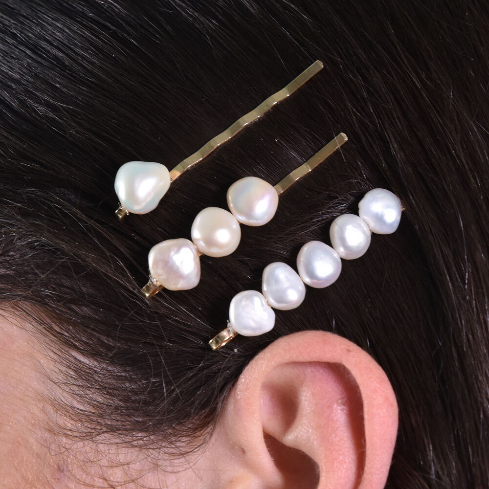 Pearl elegance paired with sweet chicness. Introducing Athena Freshwater Pearl Hair Clip Set - Culturesses very special set of handmade natural pearl hair clips for your elevated chic styling. This set includes 3 hair clips with 1, 3 and 5 pearls. The pearls featured are handpicked natural freshwater pearls with authentic lustre and smooth surface. You can create a range of different looks using 1,2 or 3 clips together. Perfect for elegant, chic, girly, coastal, formal, semi-formal, bridal, dressy, casual styles and more.