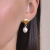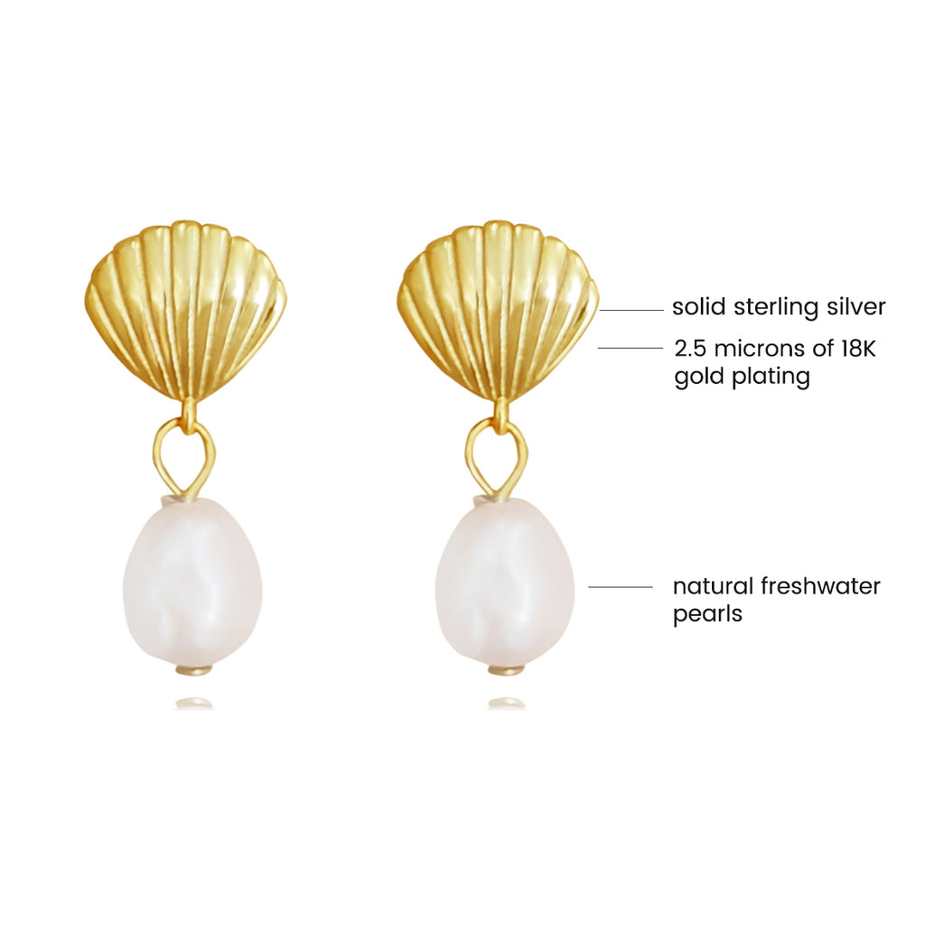 Chic pearl beauty paired with gold shells. Introducing Ada Dainty Pearl Drop Earrings - a casual and adorable pearl drop style to wear all year around, especially in summer. This design features gold shells made of solid sterling silver with 2.5 microns of 18k gold plating with dangling freshwater pearls. A versatile and lightweight ear love for a sweet and feminine touch. Perfect for modern, coastal, chic, casual styles and more. Hypoallergenic, nickel, cadmium and lead free.