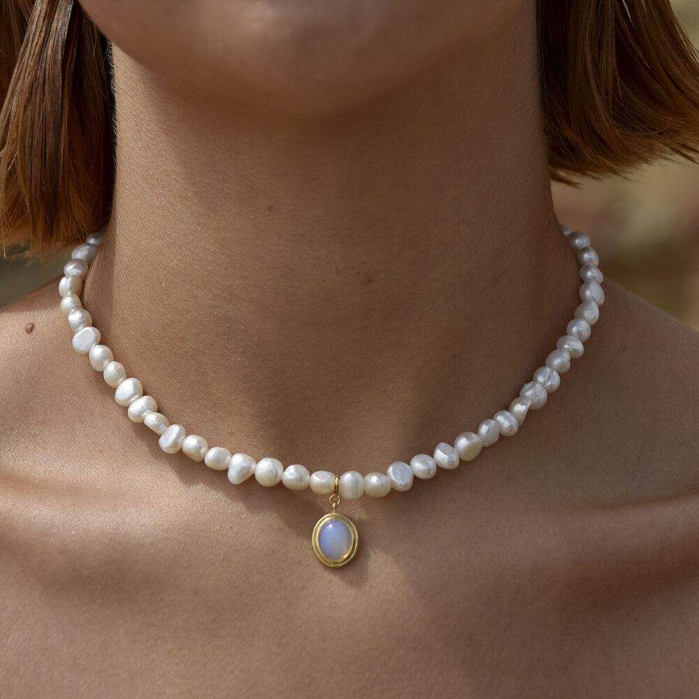 Be both soft and wild, just like the moon and the sea. Introducing Anemone Moonstone Pendant Pearl Necklace - a timeless pearl piece for a coastal touch. This design features natural freshwater pearls adorned with a moonstone pendant. The necklace chain is made in sterling silver with 18ct gold plating. This neckpiece is 43cm long including a 10.5cm adjustable link, which allows the necklace to be adjusted to a preferred personal fit. The moonstone pendant comes with a detachable clasp that allows the pendant to be clipped in a preferred position in between two pearls. Suitable for pearl and marine lovers of all ages. Hypoallergenic, nickel, lead, and cadmium free.