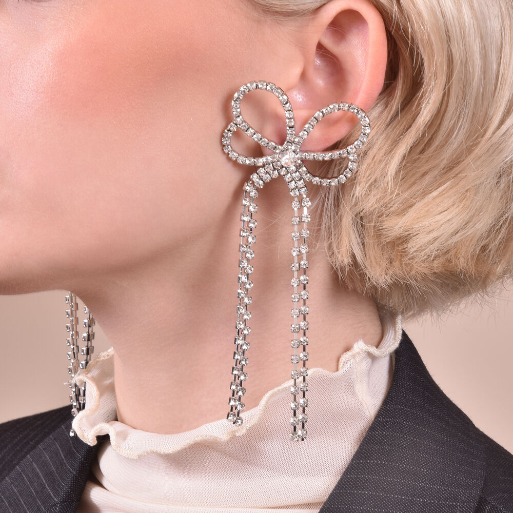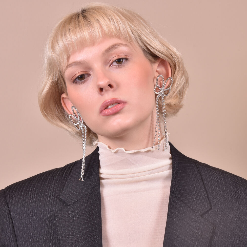 Extravagantly elegant with a sweet indulgence, introducing Annelise Catwalk Diamante Earrings a vogue inspired runway style for your exquisite high fashion taste. This feminine and magazine style ear love is crafted in environmentally friendly stainless steel with silver plating, and embellished with clear crystal diamantes for a luxurious and glamorous shimmer. Perfect for formal, semi-formal, runway, dressy, racing, fashion events, and modern fashionistas with a sense of daring. Available for both pierced and non-pierced ears.