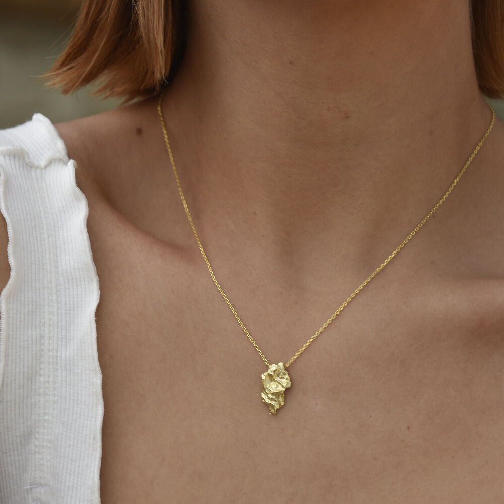 Her rawness becomes an ambiance to her presence. Introducing Artemisa Artisan Sculptural Pendant Necklace (Gold) - a creative neckpiece inspired by coastal rocky textures, landscape and earthiness. This design features a sculpted and textured pendant with a standard link chain necklace. This necklace is 45.5cm long including a 5cm adjustable link for a more flexible personal fitting. The chain and sculptured pendant are both crafted in sterling silver with 18ct gold plating for hypoallergenic wear. Suitable for contemporary, creative, coastal, layering, chic, artsy, smart casual, casual, everyday style and more. Hypoallergenic, nickel, lead, and cadmium free.