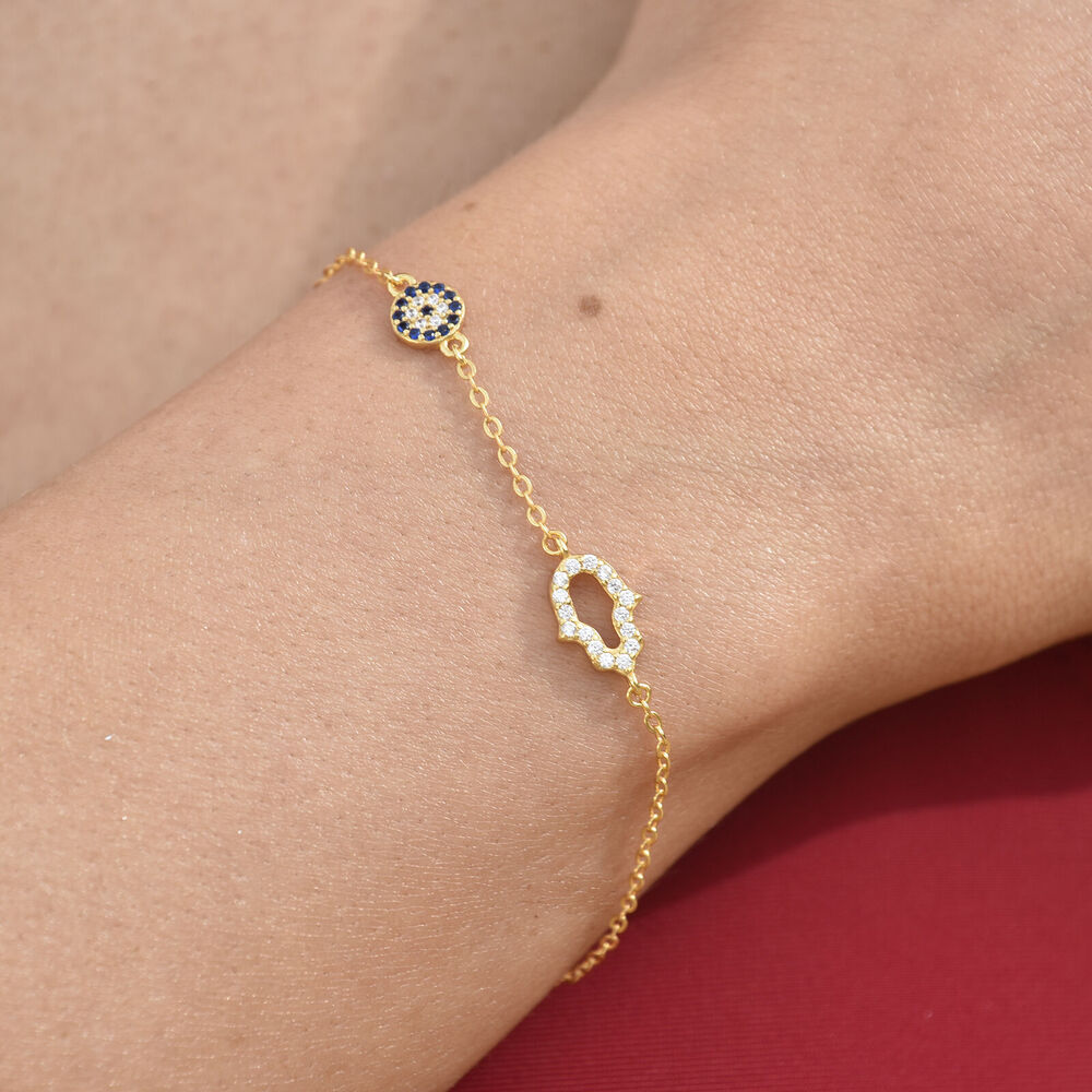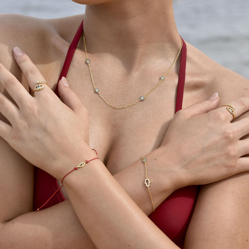 May this evil eye protect you as you go about your day. May happiness surround you and stay out of harms way. Introducing Azra Luck Evil Eye Bracelet (Gold) - a delicate and chic fine piece featuring a round blue zircon evil eye and a hand evil eye embellished with quality Austrian cubic zirconias. This bracelet is made in sterling silver with 18ct gold plating for enduring and hypoallergenic everyday wear. Perfect for layering and all personal styles, and especially for evil eye lovers. This bracelet is 20.5cm long including a 4.5cm adjustable link for a more flexible personal fit. Hypoallergenic, nickel, lead, and cadmium free. Available in 18ct gold or silver or 18ct rose gold.