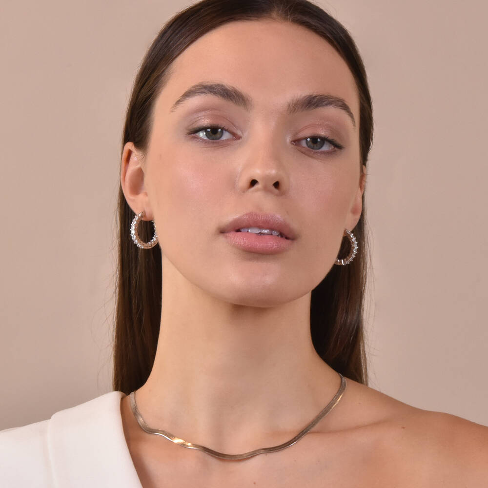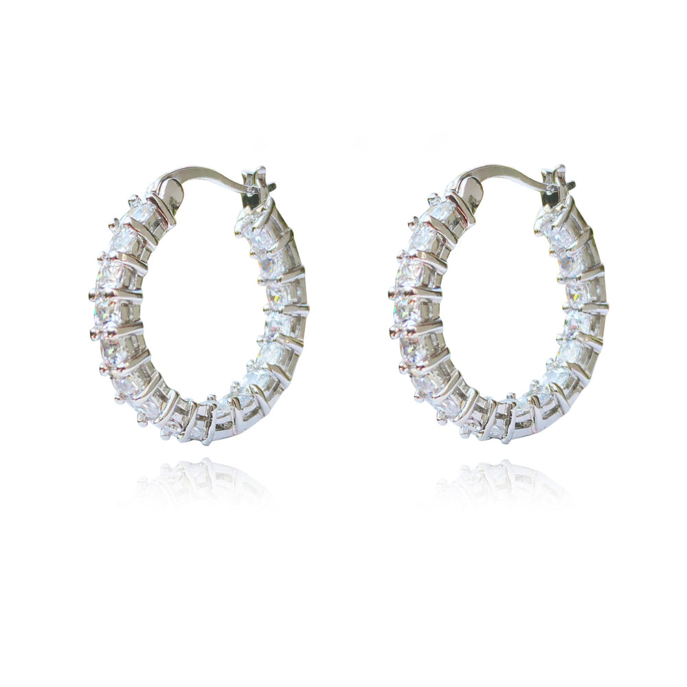 Classic hoop earrings embellished with topaz stones. Introducing Carabelle Topaz Hoop Earrings - a timeless and elegant earring piece for dress-ups and dress-downs. This design features prong set topaz stones embedded on half outer edge and half inner edge of the hoops. The earrings are made of environmentally friendly brass with platinum plating, giving the earrings an elegant silver shine (platinum) that is also tarnish resistant. Perfect for formal, semi-formal, dressy, classy, wedding, smart casual, everyday styles and more. Hypoallergenic, nickel, cadmium and lead free.