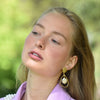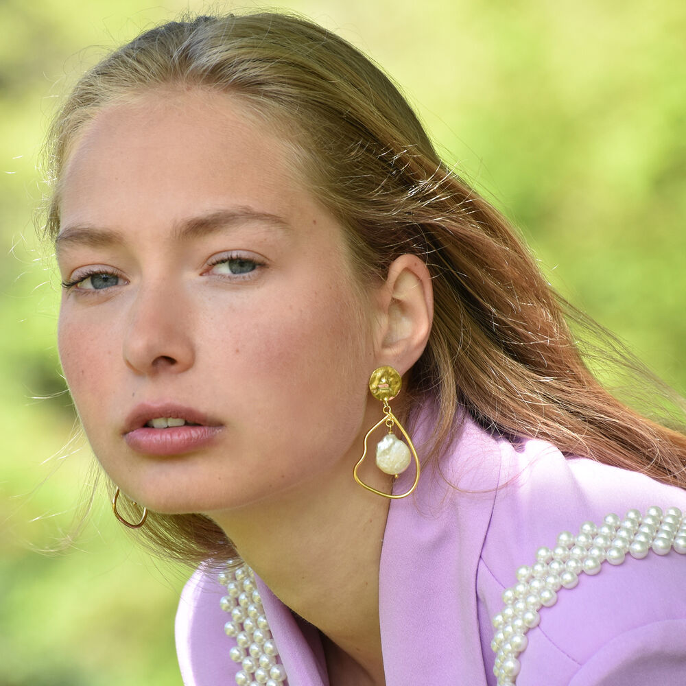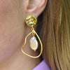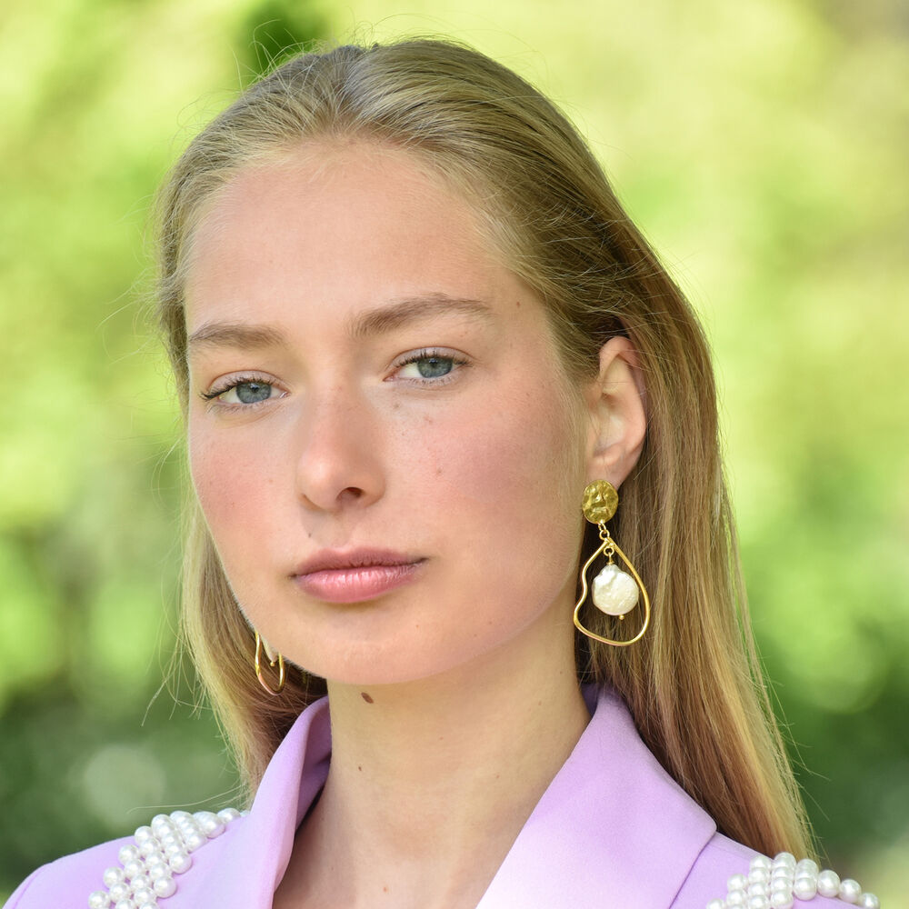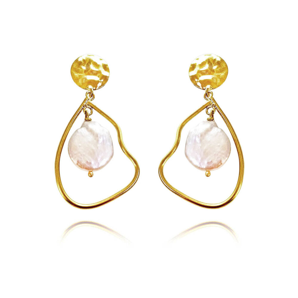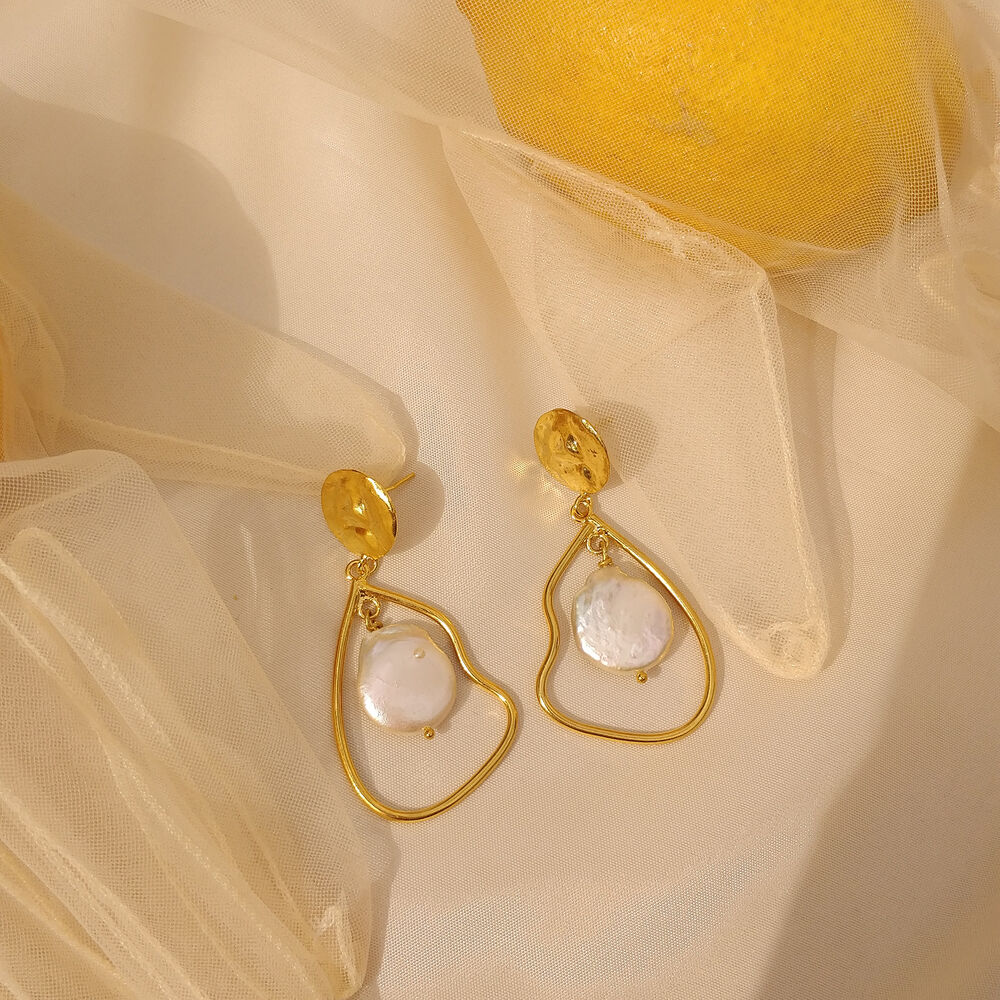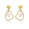 When shapes, textures and luxury blend in one. Introducing Celestia 24K Artisan Pearl Dangle Earrings - an artisan design handcrafted in our studio. Inspired by modern art and coastal cultures, this design incorporates artsy outline, original folded metal textures, hand-picked natural baroque pearls and 24K gold plated environmentally friendly brass (nickel free). An artsy and luxurious for lifelong wear. Available for both pierced and non-pierced ears. Each piece is uniquelly handcrafted with genuine baroque pearls. Nickel, lead and cadimium free.