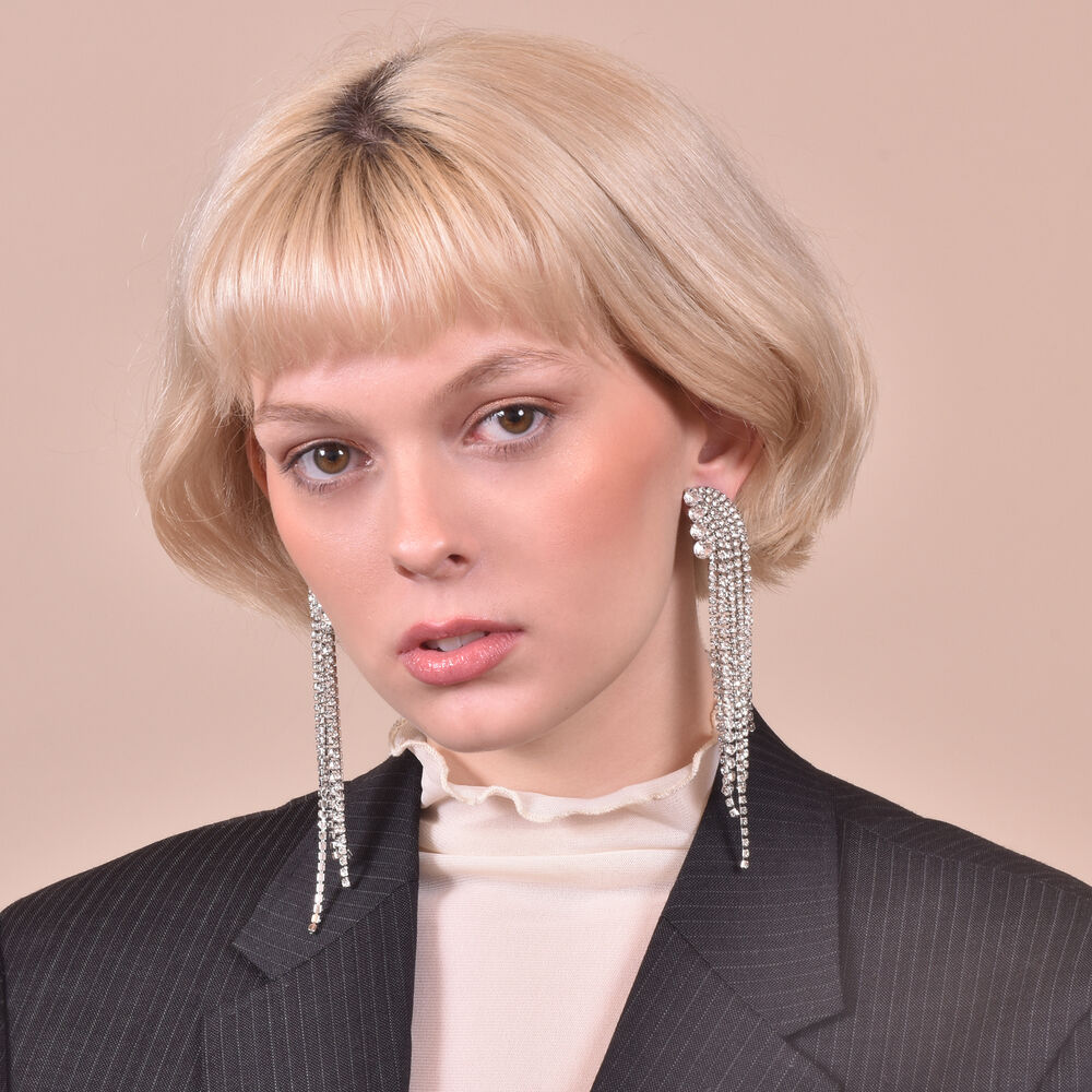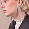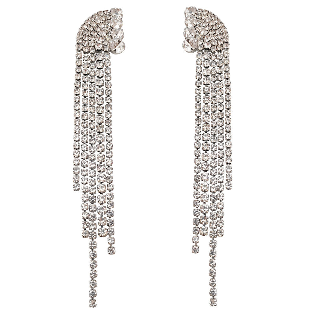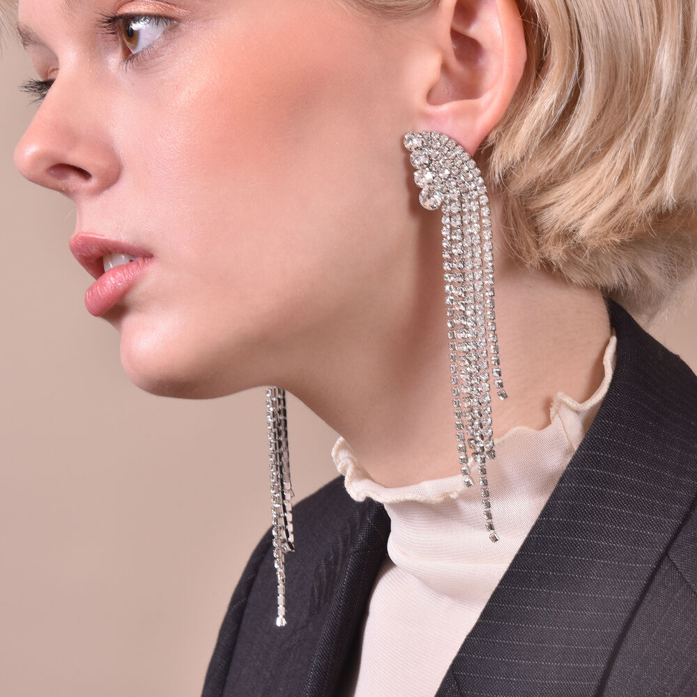 Showcase your extravagant elegance. Introducing Emilio Crystal Diamante Earrings a high-end runway style statement that is striking and without compromise. This eye-catching design is crafted in environmentally friendly stainless steel (nickel free) with silver plated metal strings and crystal encrusted clear diamantes. With a gorgeous shimmer and a creative flow, express your high fashion attitude and libration in fashion styling. Nickel, cadmium and lead free.