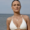 This necklace is 46cm long. Please kindly note that the position of the necklace sitting on your neck can vary from individual to individual depending on your top size. Model is a size 8.
