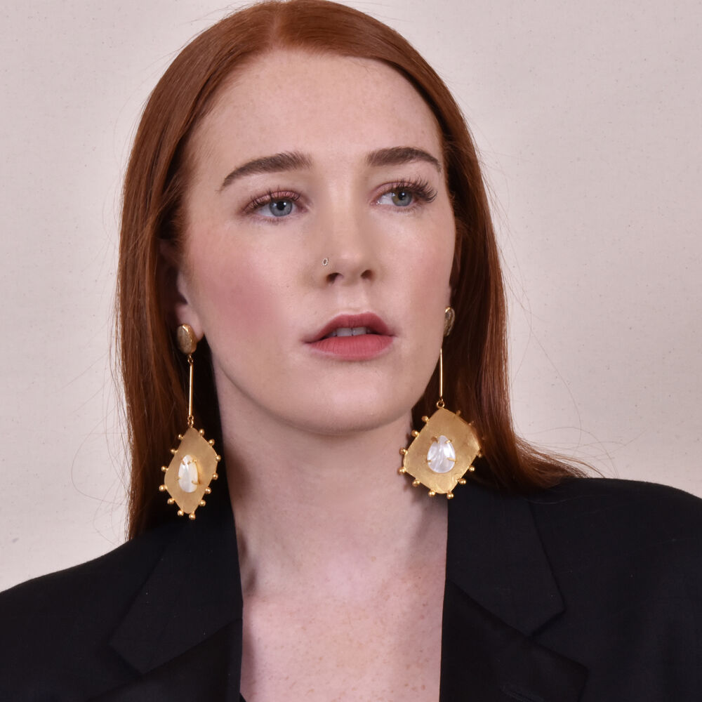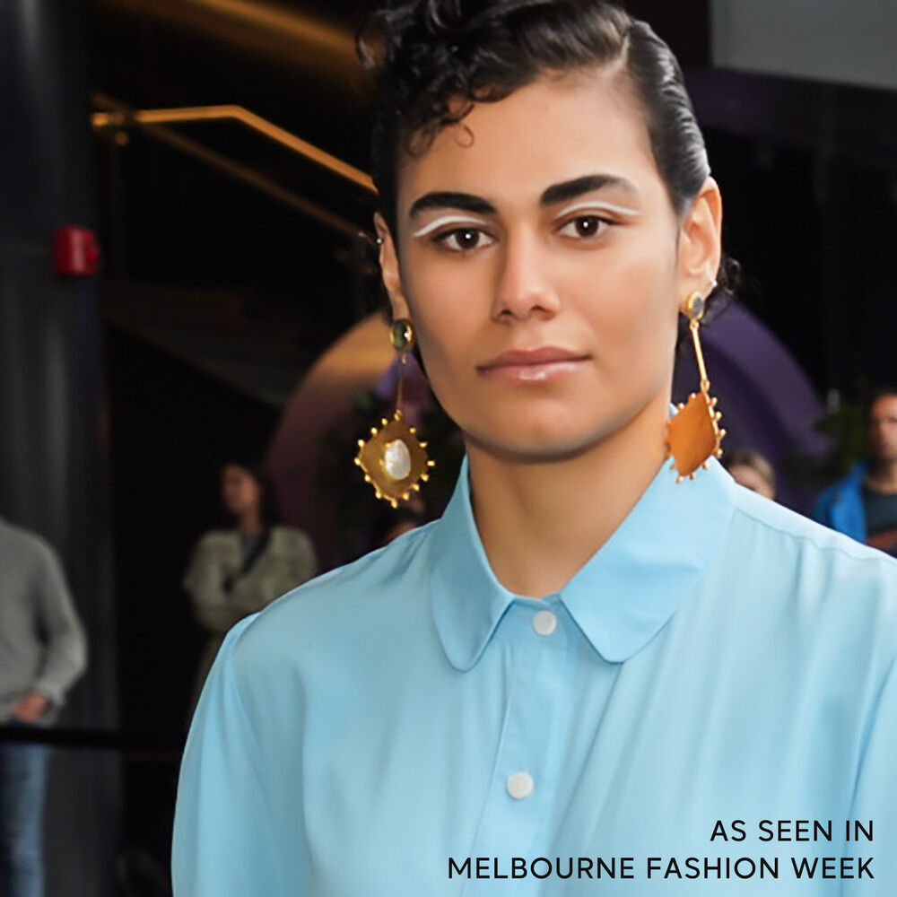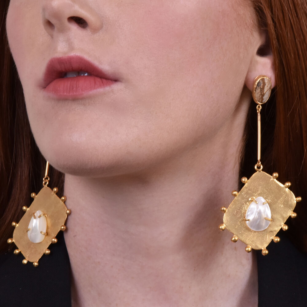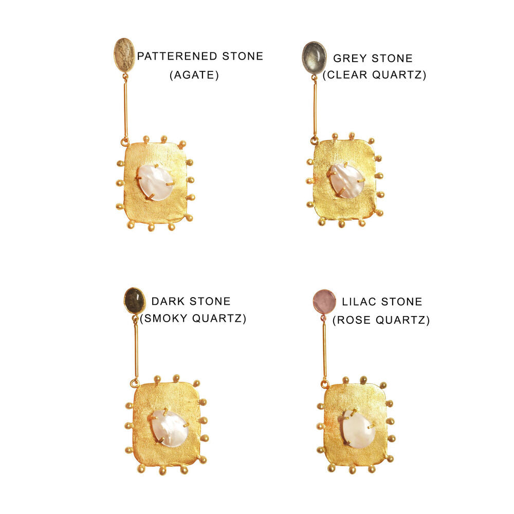 Take artsy jewellery to another level! Handmade with love, Florence Luxury 24K Gold Dangle Earrings are an epic contemporary statement piece for lifelong wear. Handcrafted using environmentally friendly copper with 24K gold plating and natural mother of pearls, this art piece contains luxury details and original textures. Each piece is uniquely handmade, and you won't find an identical piece. Perfect for special occasions and fashion show case. Comes with 4 different coloured head stones. Available for non-pierced ears. Allergy free. *Original handmade textures exist. Headstones: Dark Stone: Smoky Quartz Grey Stone: Clear Quartz Patterened Stone: Agate Lilac Stone: Rose Quartz
