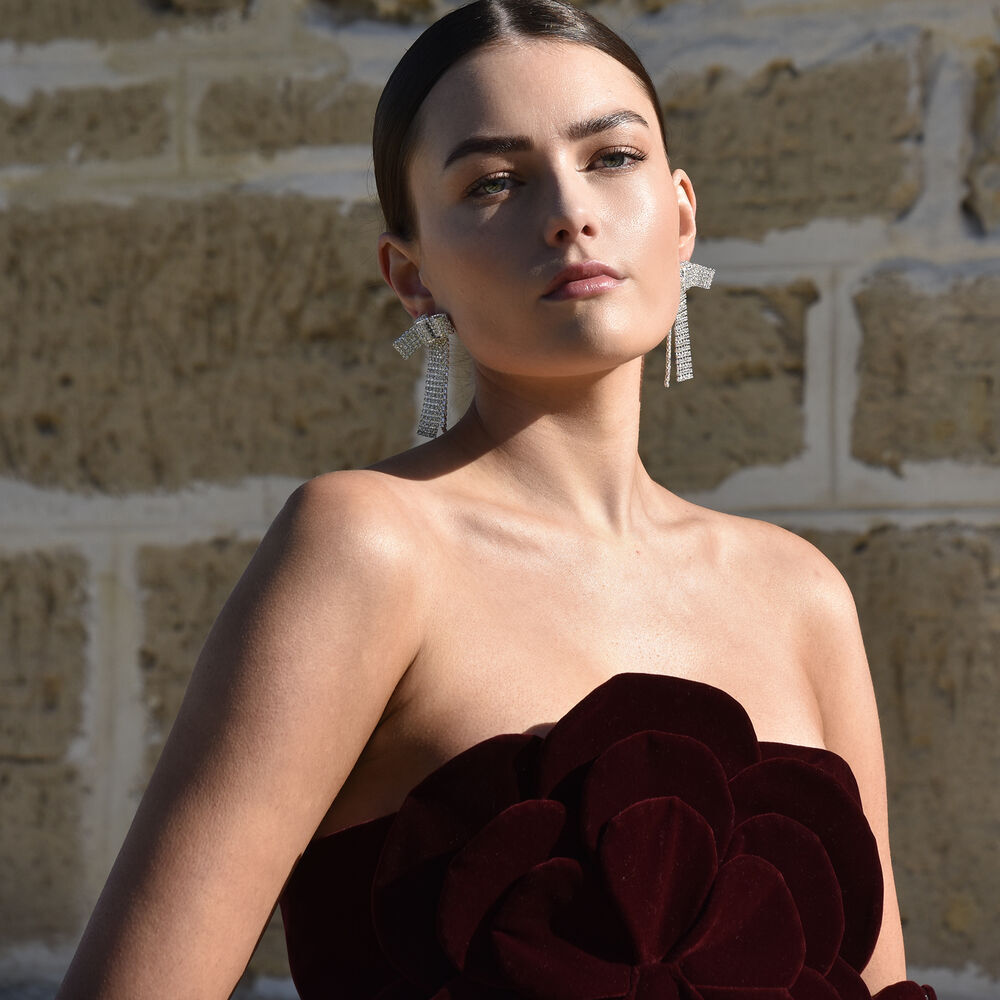 Radiate confidence with every shimmer. Introducing Irvine Silver Bow Tie Earrings - a feminine and chic statement to shine a little brighter. This design features bow-tie shaped diamante earrings with a cute ribbon fold and drop. The earrings are made in environmentally friendly brass with silver plating. A statement that compliments formal, semi-formal, dressy, smart casual, styles and more. Hypoallergenic, nickel, cadmium and lead free.