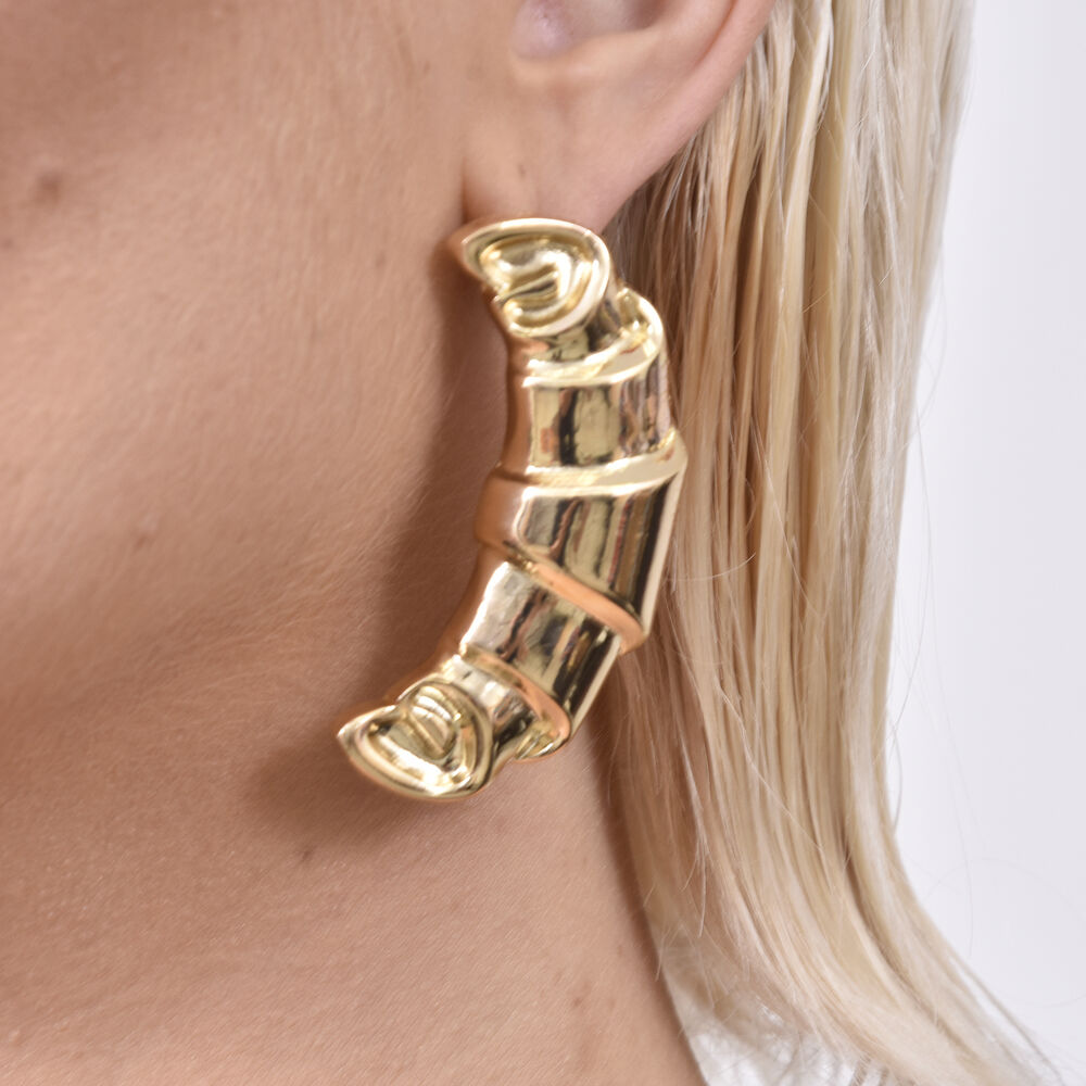 Life is uncertain, have croissant first. Introducing Louane Croissant Statement Earrings (Gold) - an unapologetic statement for croissant and style lovers. This design features croissant-shaped earrings of quality weight (20.6g per earring) and significant size. The earrings are made in environmentally friendly brass with 18K gold plating. Suitable for modern, creative, runway, smart casual, casual styles and more. Hypoallergenic, nickel, lead, and cadmium free.