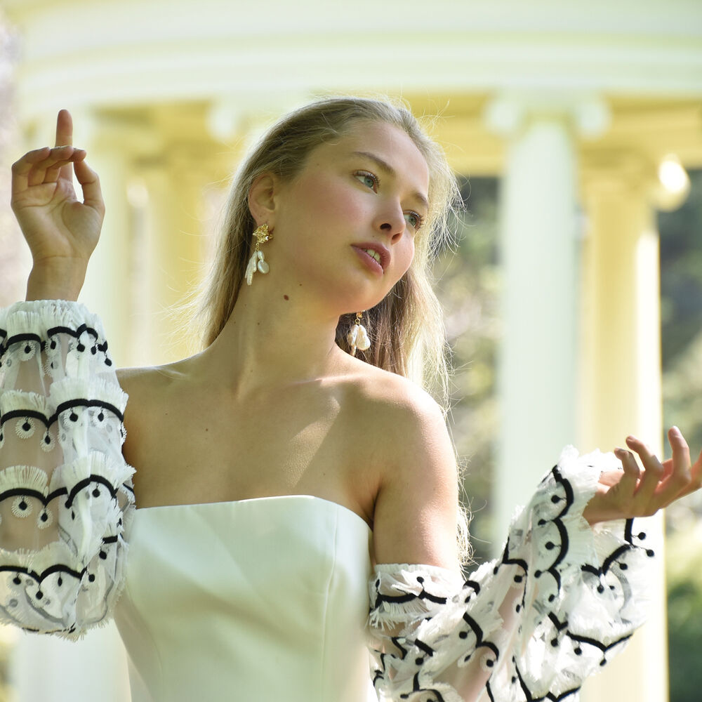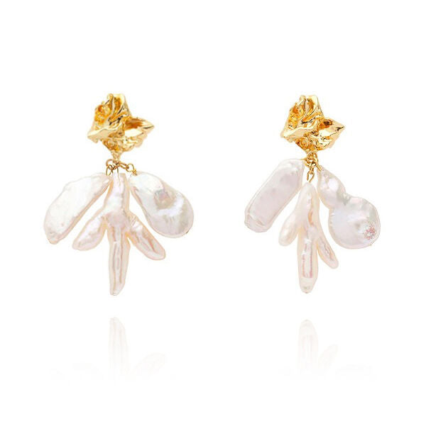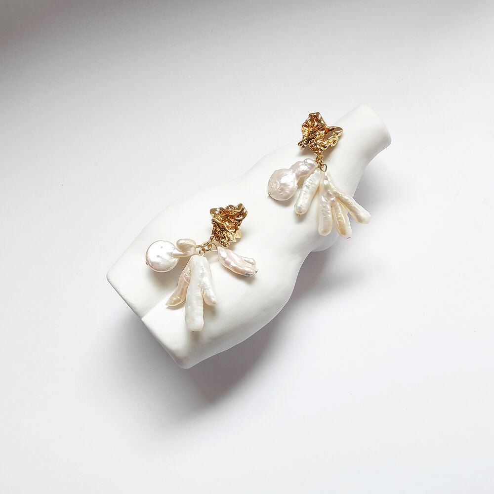 The pearls used in this design are baroque keshi pearls. Keshi pearls are the rarest of all baroque freshwater pearls. In the case of a Keshi pearl, the mollusk somehow was able to reject the particle or seed but continues to form a pearl. Because of this they dont have a centre seed or particle and are composed of all nacre. This lack of a nucleus allows them to become very unusually shaped and have a very high lustre.
