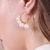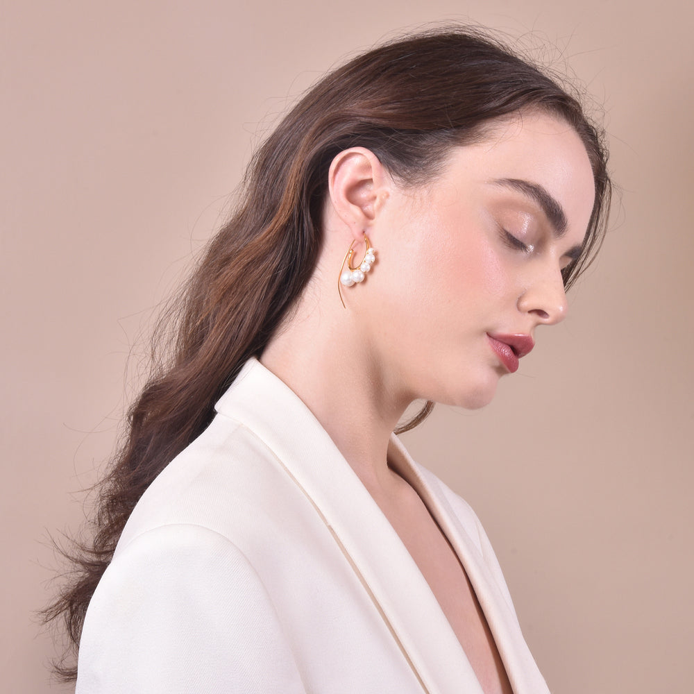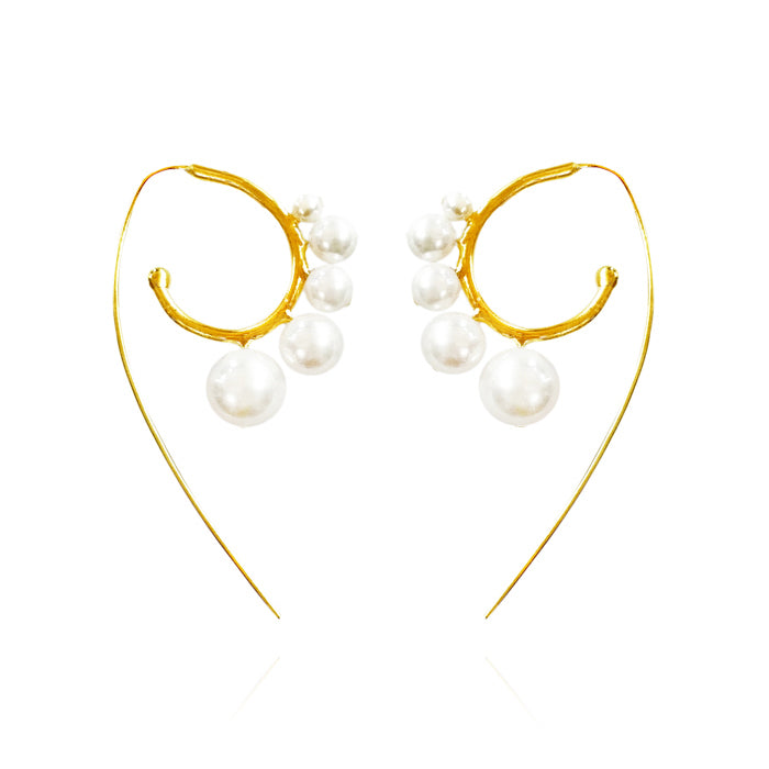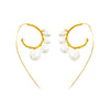 Art makes everything flow. Introducing Romane 24K Artisan Pearl Flow Earrings - an artisan design handcrafted with love. This unique and creative design incorporates an elegant arched flow with various sized cultured Akoya pearls placed on the turning edge, carving a gorgeous pearl flow around your ears. Our artisan earring range uses environmentally friendly brass (nickel free) with high quality 24K gold plating, making each piece an artsy and luxurious delight for lifelong wear.