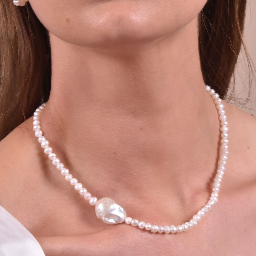 Elegance that attracts a second glance. Introducing Milani Off Centre Pearl Necklace a unique pearl necklace that excels and challenges the norm. This design features natural freshwater pearls with a larger baroque pearl pendant positioned to one side, forming an asymmetric aesthetic beauty that steals a second glance. Perfect for those who seek something different yet tick the elegance and timelessness box. Hypoallergenic, nickel, cadmium and lead free.