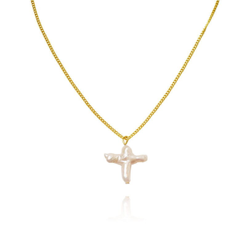 Handmade freshwater pearl necklace featuring 1 cross-shaped freshwater pearl and 14K gold-plated necklace made of environmentally friendly brass (nickel free)