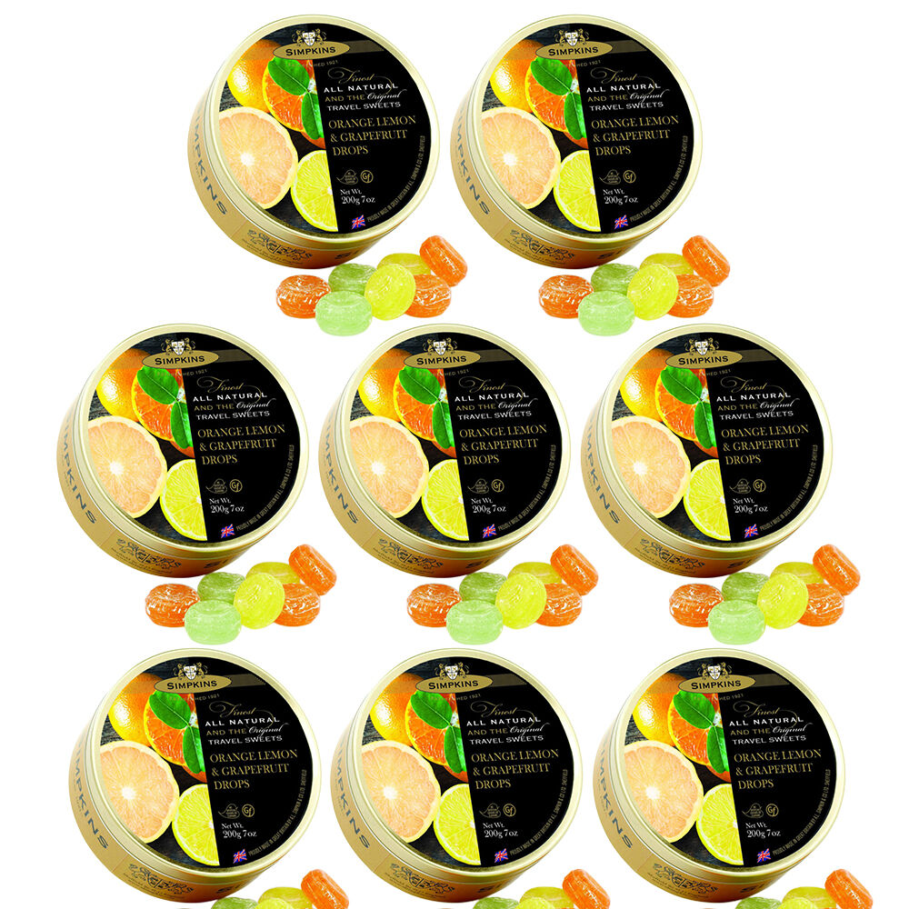Simpkins Citrus Fruit Drops 8 x 200g Tins Orange Lemon Grapefruit Travel Sweets
