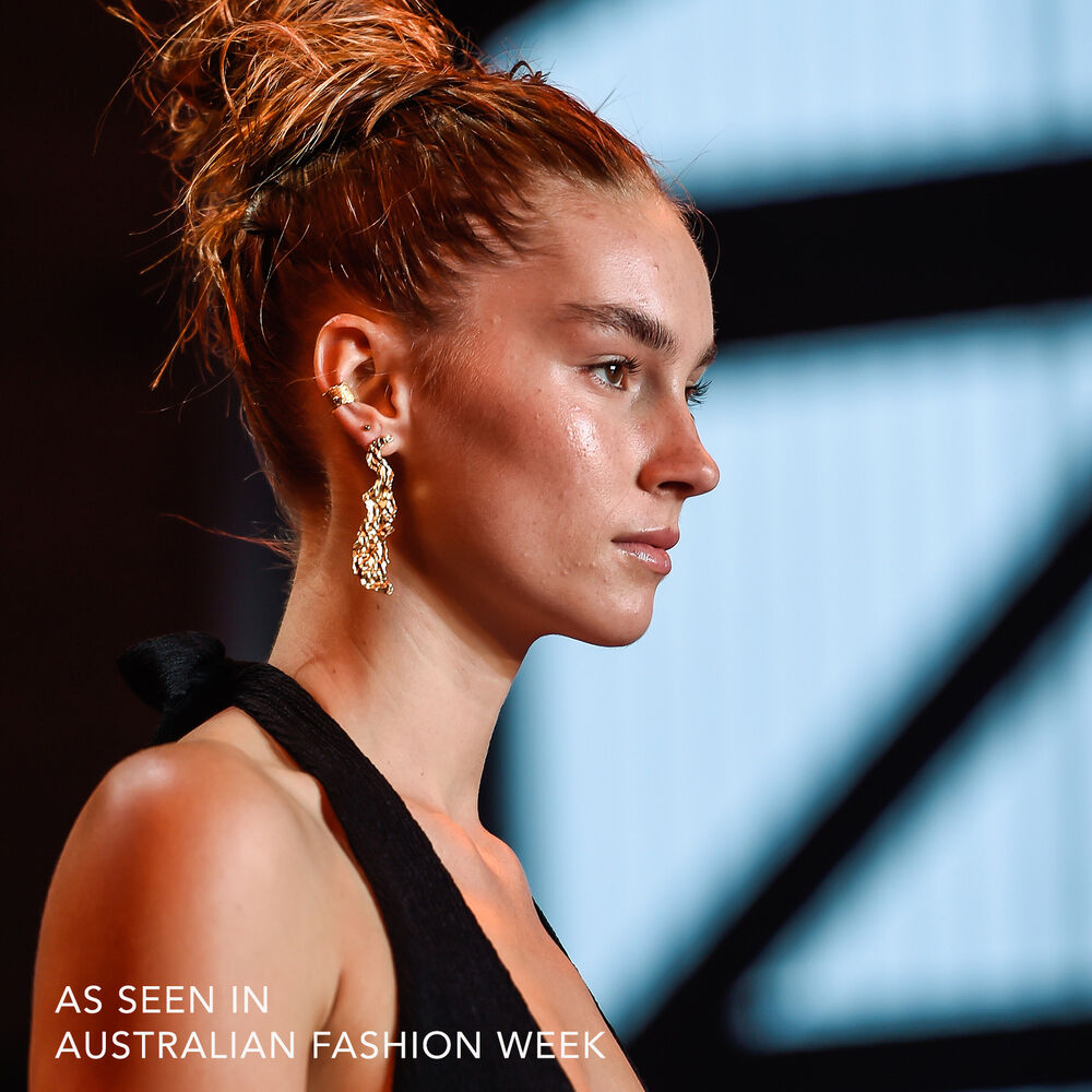 Textured art earrings inspired by coastal culture. Introducing Azure 22K Sculpture Art Earrings - an artisan crafted contemporary earring style for lovers of texture and uniqueness. This design features oyster shell textured gold with a shiny finish. The earrings are made of environmentally friendly brass (nickel free) with 2.5 microns of 22k gold plating, giving the pieces a luxurious gold shine that endures with time. An artsy and tasteful statement for modern, creative, dressy, high fashion, smart casual, casual styles and more. Hypoallergenic, nickel, cadmium and lead free.
