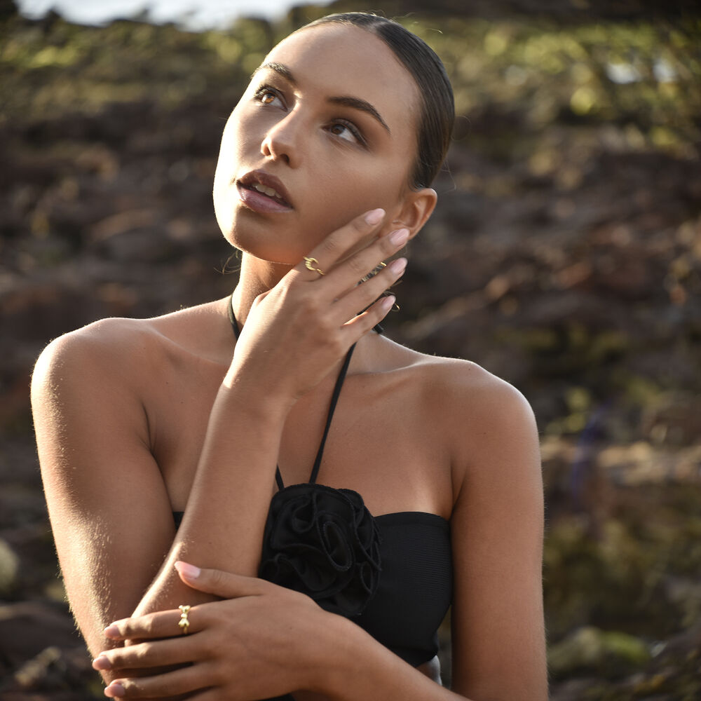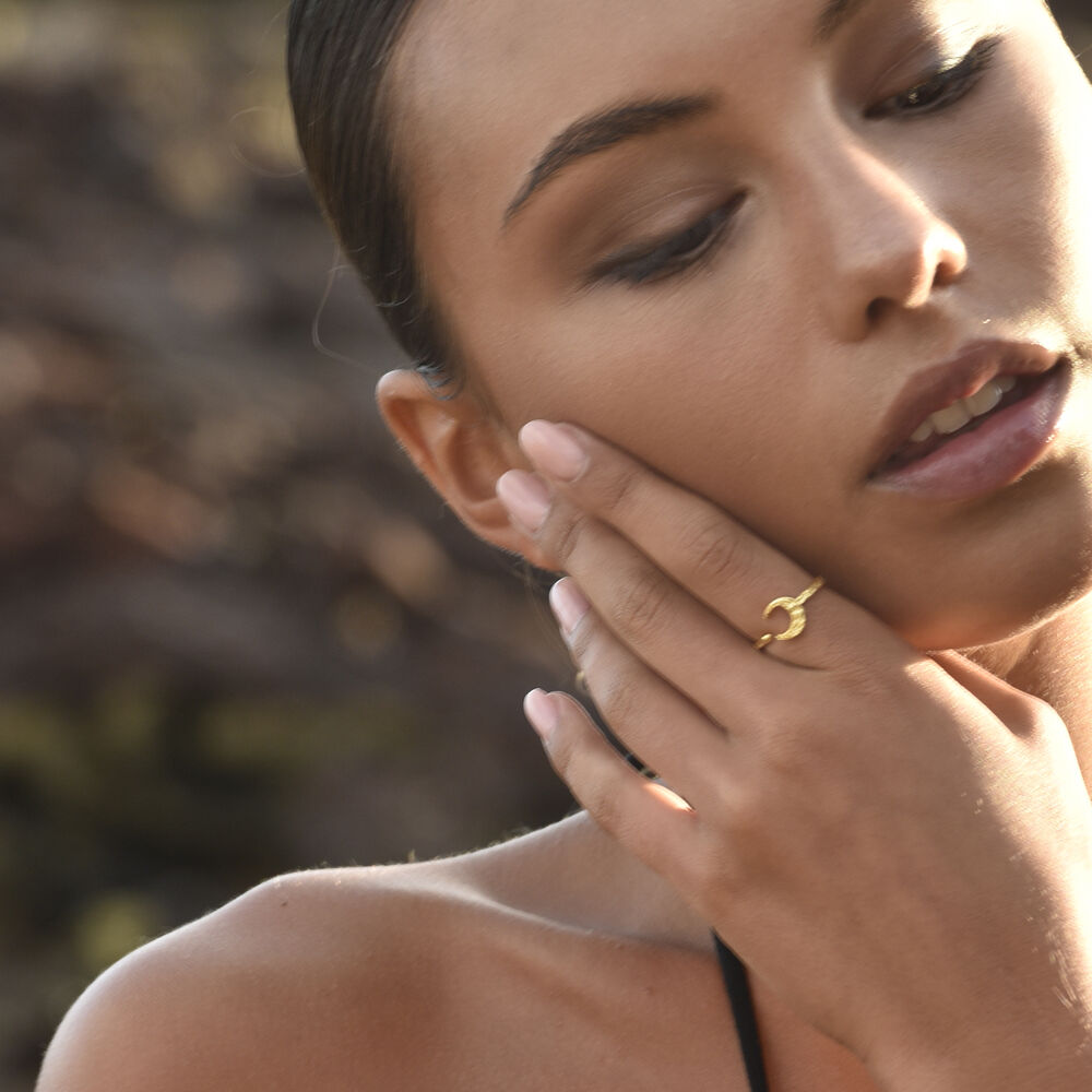 Introducing Chandra Artisan Crescent Moon Open Ring (Gold) - an artisan crafted finger beauty embracing the spiritual and poetic beauty of the moon. This design features a textured open ring band with a crescent moon at one end. This ring is made of solid sterling silver with 2.5 microns of 18K gold plating for a noble and rich gold shine as well as for hypoallergenic wear. This ring can be easily adjusted manually for your ideal fit. Perfect for modern, bohemian, coastal, chic, ring layering, smart casual, casual, everyday wear and more. Available in gold or silver. Hypoallergenic, nickel, lead, and cadmium free.