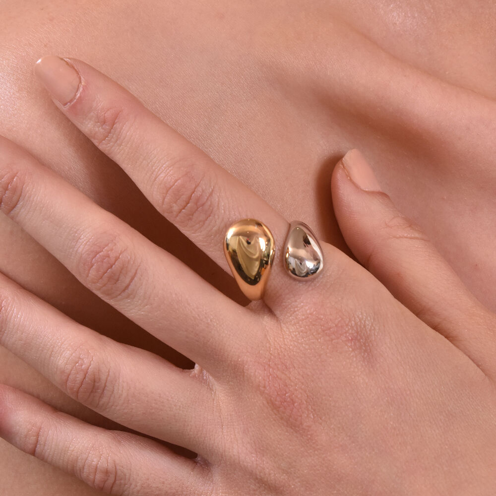Blending gold and silver harmoniously and artistically. Introducing Monique Dual Tone Open Ring a most unique two tone finger art that exhibits your extraordinary taste and style. This design is crafted in titanium steel (nickel free) with 18K gold plating and rhodium plating, giving the ring a subtle, artsy and sleek divide. It is a perfect modern statement balancing femininity and masculinity. It is fully resizable and adjustable manually so you can adjust for the most perfect fit. Perfect for modern, chic, punk, bold, minimalist, high fashion, everyday styles and more. Hypoallergenic, nickel, cadmium and lead free.