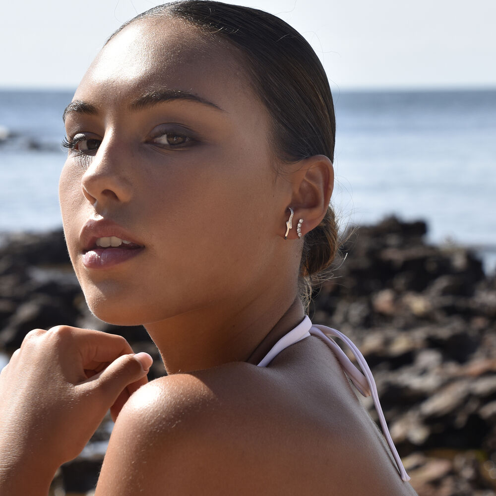Dainty chicness with a soft curve. Introducing Alanna Diamante Curve Stud Earrings (Silver) - a delicate and unique ear stud for a subtle shimmer. This design features curved studs with a row of four Austrian cubic zirconias in claw settings. The earrings are made in solid sterling silver for hypoallergenic wear. Perfect for girls and women of all ages and for all personal styles. Perfect for earring layering. Hypoallergenic, nickel, lead, and cadmium free.