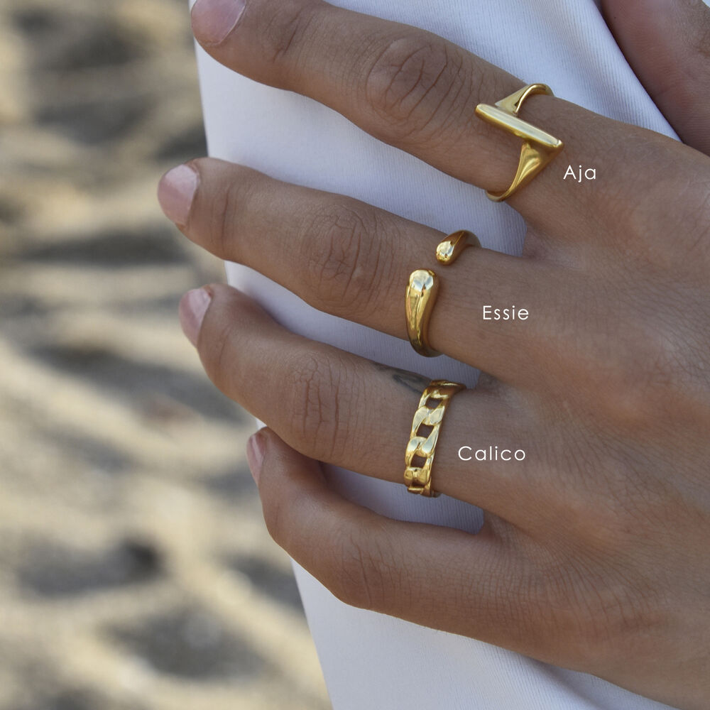 Modern, classy and sleek. Introducing Essie Simplicity Gold Vermeil Open Ring - a contemporary style finger beauty with smooth curves and edges. This design features a classic solid ring band with two ends in a teardrop shape with an asymmetrical beauty. The ring is made in solid sterling silver with 2.5 microns of quality 18K gold plating (to Gold Vermeil & Premium Jewellery Standards). Due to the softness of sterling silver, this ring can be easily adjusted manually for your ideal fit. Perfect for modern, classy, creative, chic, feminine, artsy, statement, minimalist, ring stacking, smart causal, casual, everyday styles and more. Hypoallergenic, nickel, cadmium and lead free.