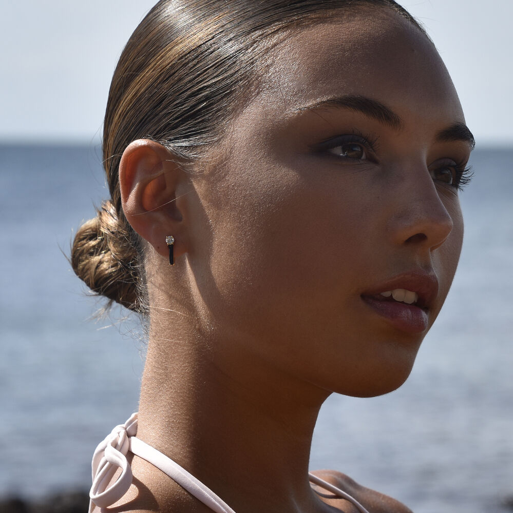 Life is a sea of vibrant colours, jump in. Introducing Gabriela Diamante Enamel U Huggie Earrings (Black) - a trendy and chic casual ear love to brighten your mood and presence. This design features U-shaped huggie earrings with the front in a black enamel coating, adorned with a clear diamante on the top. The earrings are made in sterling silver with 18K gold plating for hypoallergenic wear. Perfect for woman and girls of all ages and for all personal styles. Perfect for layering. Hypoallergenic, nickel, lead, and cadmium free.