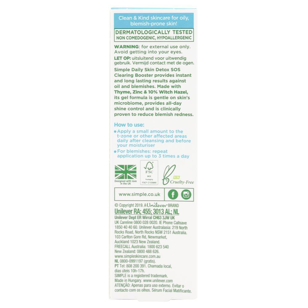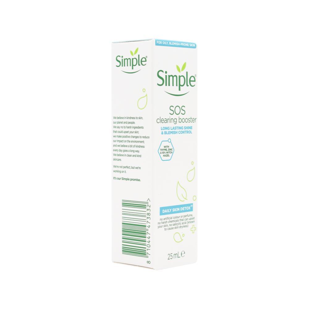 Simple Daily Skin Detox SOS Clearing Booster is made with a detoxifying blend of concentrated 10% witch hazel, thyme and zinc, to provide long-lasting results against oily skin and blemishes whilst being gentle on your skin.